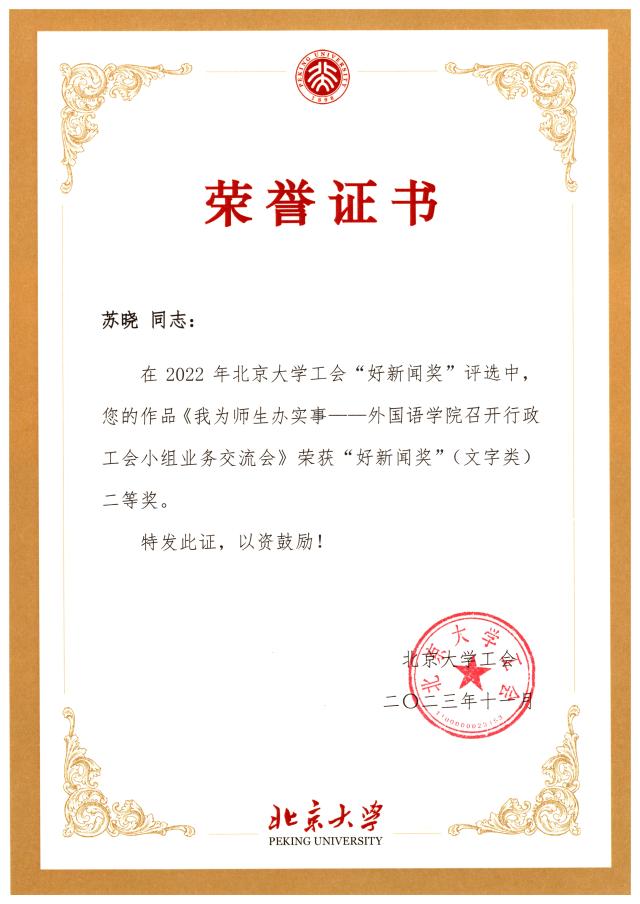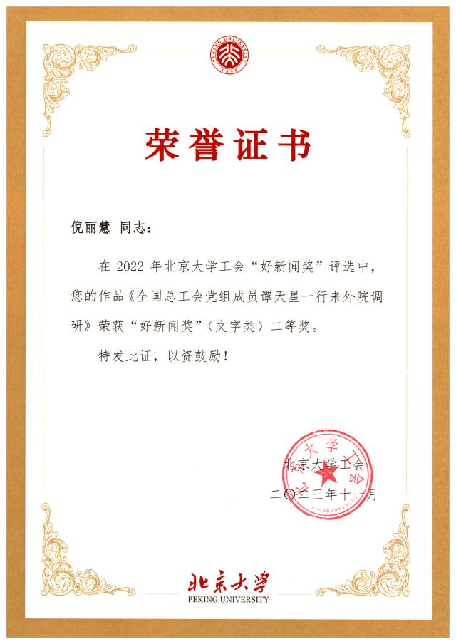 拼搏手机版登录入口工会多位老师获得好新闻奖:外院工会主席张冬梅老师的《快乐羽毛球——羽动心飞扬》荣获图片类三等奖、工会常务副主席倪丽慧老师的《全国总工会党组成员谭天星一行来外院调研》荣获文字类二等奖、工会会员苏晓老师的《我为师生办实事——拼搏手机版登录入口召开行政工会小组业务交流会》荣获文字类二等奖、苏晓老师的《同心勠力——鼓舞心齐》荣获图片类二等奖。恭喜几位老师在北京大学工会“好新闻奖”评选中取得好成绩!
