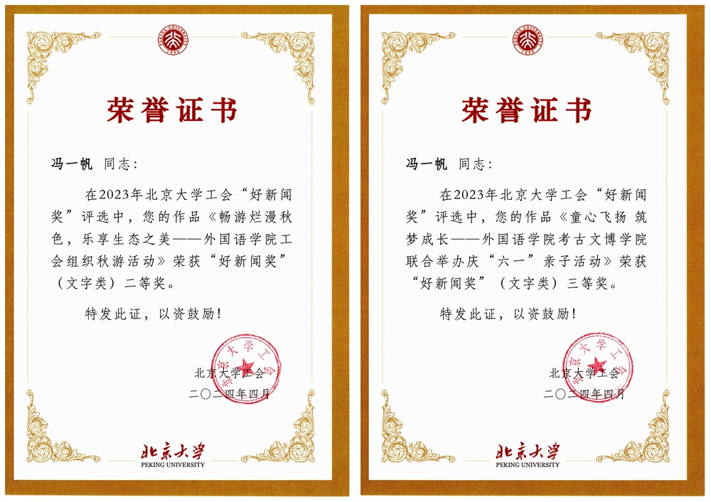 在2023年北京大学工会“好新闻奖”评选中,校工会邀请专家评委,结合工会工作特点,从新闻题材、宣传效果、稿件可读性与写作规范、图片视觉冲击力与信息含量等方面,对参评稿件和图片进行了逐一评议。外院工会会员冯一帆老师的图片作品“童心飞扬 筑梦成长”荣获“好新闻奖”(图片类)一等奖、工会主席张冬梅老师的图片作品“巾帼迈进,竞绽芳华” 荣获“好新闻奖”(图片类)三等奖。冯一帆老师的新闻作品“畅游烂漫秋色,乐享生态之美——拼搏手机版登录入口工会组织秋游活动”和“童心飞扬 筑梦成长——拼搏手机版登录入口考古文博学院联合举办庆‘六一’亲子活动”分别荣获“好新闻奖”(文字类)二等奖、三等奖。