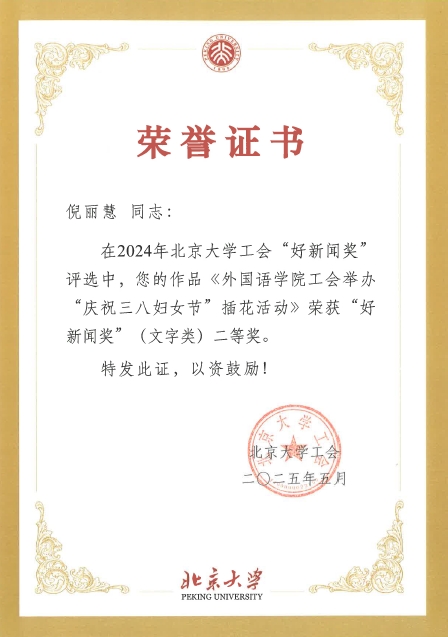在2024年北京大学工会“好新闻奖”评选中,校工会特邀请专家评委,结合工会工作特点,从新闻题材、宣传效果、稿件可读性与写作规范、图片视觉冲击力及与主题切合度等方面,同时依据评奖通知要求,对参评稿件和图片进行了逐一评议,拼搏手机版登录入口倪丽慧《拼搏手机版登录入口工会举办“庆祝三八妇女节” 插花活动》荣获好新闻奖(文字类)二等奖;冯一帆《拼搏手机版登录入口举行2024年新春团拜会》荣获好新闻奖(文字类)二等奖;王乃懋《寻迹运河源, 感悟新理念一一拼搏手机版登录入口工会组织春游活动》和《拼搏手机版登录入口羽毛球队荣获2024年北京大学教职工羽毛球赛乙组季军》荣获好新闻奖(图片类)三等奖。