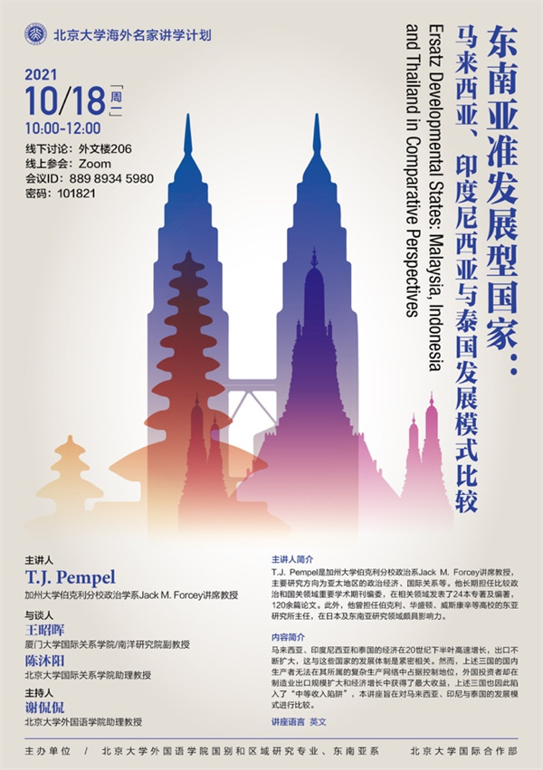 2021年10月18日,拼搏手机版登录入口东南亚系、国别和区域研究专业在国际合作部“海外名家讲学计划”的支持下举办了“东南亚准发展型国家:马来西亚、印度尼西亚与泰国发展模式比较”的主题讲座。主讲人彭佩尔(T.J. Pempel)是加州大学伯克利分校政治系讲席教授,主要研究方向为亚太地区的政治经济、国际关系等。他长期担任比较政治和国关领域重要学术期刊编委,在相关领域发表了24本专著及编著,120余篇论文。此外,他曾担任伯克利、华盛顿、威斯康辛等高校的东亚研究所主任,在日本及东南亚研究领域颇具影响力。彭佩尔教授的此次讲座基于其专著《多重制度塑造的区域:亚太地区的经济繁荣与劫掠》(A Region of Regimes: Prosperity and Plunder in the Asia-Pacific),于2021年由康奈尔大学出版社出版。