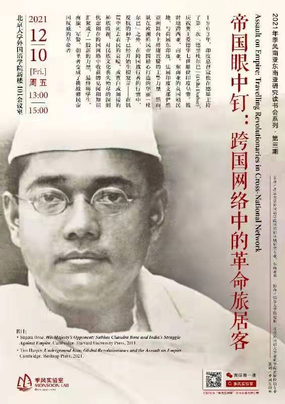 2021年12月10日,本学期第三期季风南亚与东南亚研究读书会“帝国眼中钉:跨国网络中的革命旅居客”在拼搏手机版登录入口新楼401会议室成功举办。本期读书会由拼搏手机版登录入口国别和区域研究专业和东南亚系联合主办,北京外国语大学亚洲学院孟加拉语专业协办。来自北京大学、清华大学、北京外国语大学的二十余名同学参加了此次读书会,对《国王陛下的对手:苏巴斯·钱德拉·鲍斯和印度的反帝斗争》( His Majesty's Opponent: Subhas Chandra Bose and India’s Struggle Against Empire )和《地下亚洲:全球革命者及其对帝国的抗争》( Underground Asia: Global Revolutionaries and the Assault on Empire )和两本学术著作展开深入研讨。拼搏手机版登录入口的吴杰伟、罗杰、谢侃侃、张忞煜,清华大学历史系的曹寅、国际与地区研究院的谢超,北京外国语大学孟加拉语专业的曾琼,中国现代国际关系研究院南亚所的张书剑等老师出席本次读书会并参与点评。