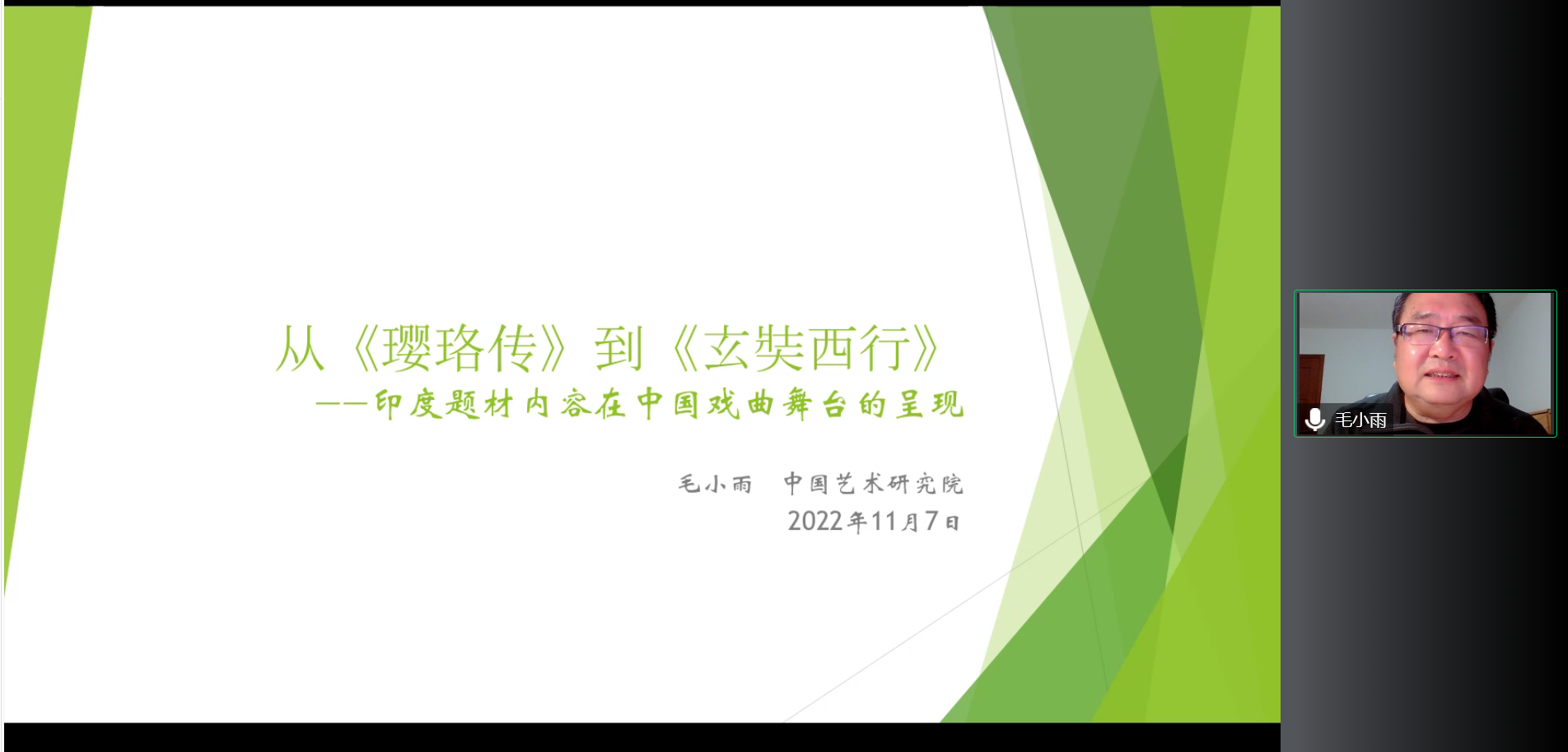 2022年11月7日晚,“东方大文学”系列讲座第十二讲“从《璎珞传》到《玄奘西行》——印度题材内容在中国戏曲舞台的呈现”在线上成功举办。本次讲座由教育部人文社科重点研究基地北京大学东方文学研究中心主办,拼搏手机版登录入口南亚学系协办,中国艺术研究院戏曲研究所研究员毛小雨担任主讲人,拼搏手机版登录入口副教授张嘉妹担任主持人,拼搏手机版登录入口助理教授张忞煜担任评议人。