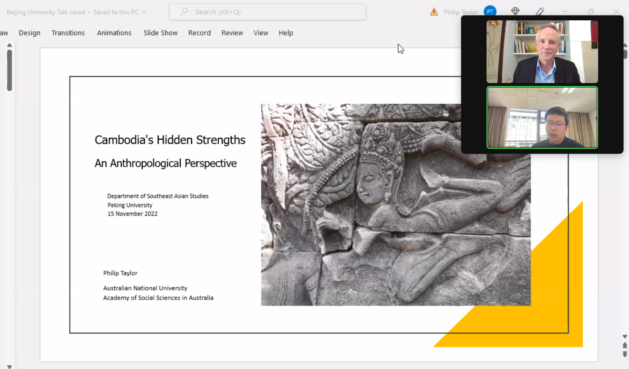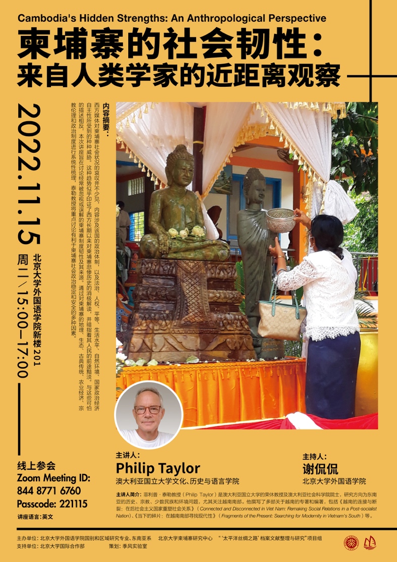 2022年11月15日,澳大利亚国立大学菲利普·泰勒(Philip Taylor)教授应拼搏手机版登录入口邀请进行了一场线上讲座,题为“柬埔寨的社会韧性:来自人类学家的近距离观察”。此次讲座由北京大学柬埔寨研究中心、北大外院国别和区域研究专业、东南亚系及“‘太平洋丝绸之路’档案文献整理与研究”项目组联合主办,并得到北京大学国际合作部的支持。