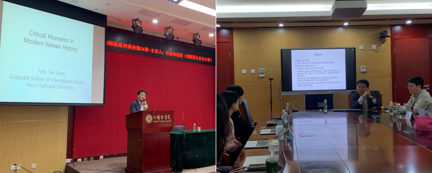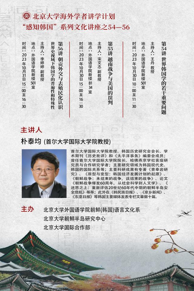 2023年10月30日至31日,受“北京大学海外学者讲学计划”支持,由拼搏手机版登录入口朝鲜(韩国)语言文化系、北京大学朝鲜半岛研究中心、北京大学国际合作部共同主办的“感知韩国”系列讲座第五十四至五十六讲在外院新楼成功举办。三场讲座主题分别为“世界韩国学的若干重要问题”“越南战争与美国的误判”“朝贡外交与去殖民化认识——世界史视域下韩国学的普遍性和特殊性”,主讲人为韩国首尔大学国际大学院朴泰均教授,由拼搏手机版登录入口副院长王丹教授、朝(韩)语系宋文志副教授、系主任李婷婷副教授主持,朝(韩)语系全体教师出席,全系各年级同学也积极参与了讲座。