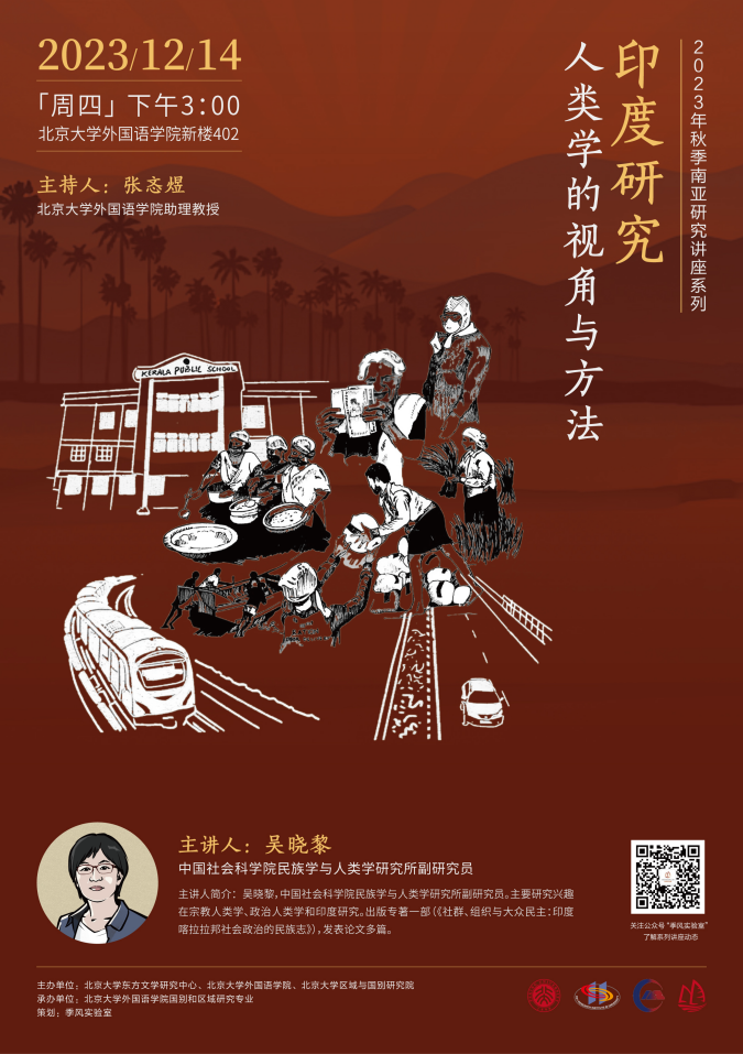 2023年12月14日,中国社会科学院民族学与人类学研究所吴晓黎副研究员应邀为我校师生进行题为“印度研究:人类学的视角与方法”的讲座。本次讲座是由北京大学东方文学研究中心、拼搏手机版登录入口和区域与国别研究院主办,拼搏手机版登录入口国别和区域研究专业承办的2023年秋季学期南亚研究系列讲座的第五讲。讲座由拼搏手机版登录入口张忞煜助理教授主持,中国人民大学国际关系学院曹德军副教授、北京外国语大学区域与全球治理高等研究院许娟助理研究员出席本次讲座并参与讨论。