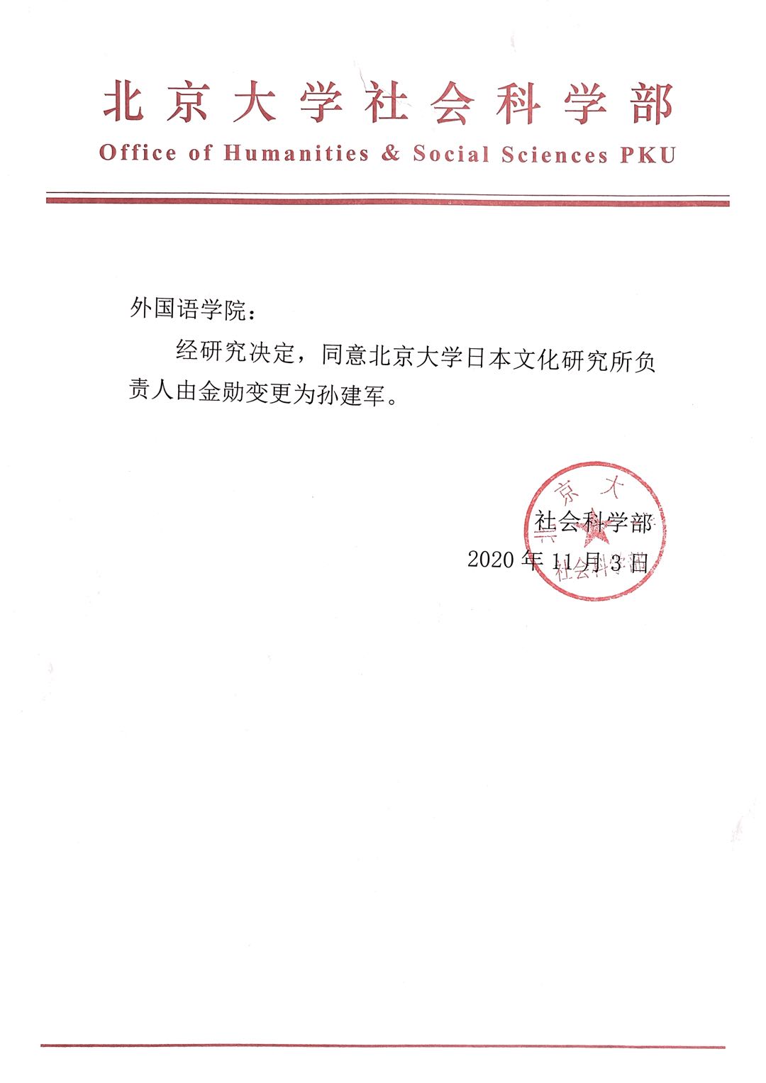 日本文化研究所负责人变更批件,负责人由金勋变更为孙建军,批准时间为2020年11月3日。