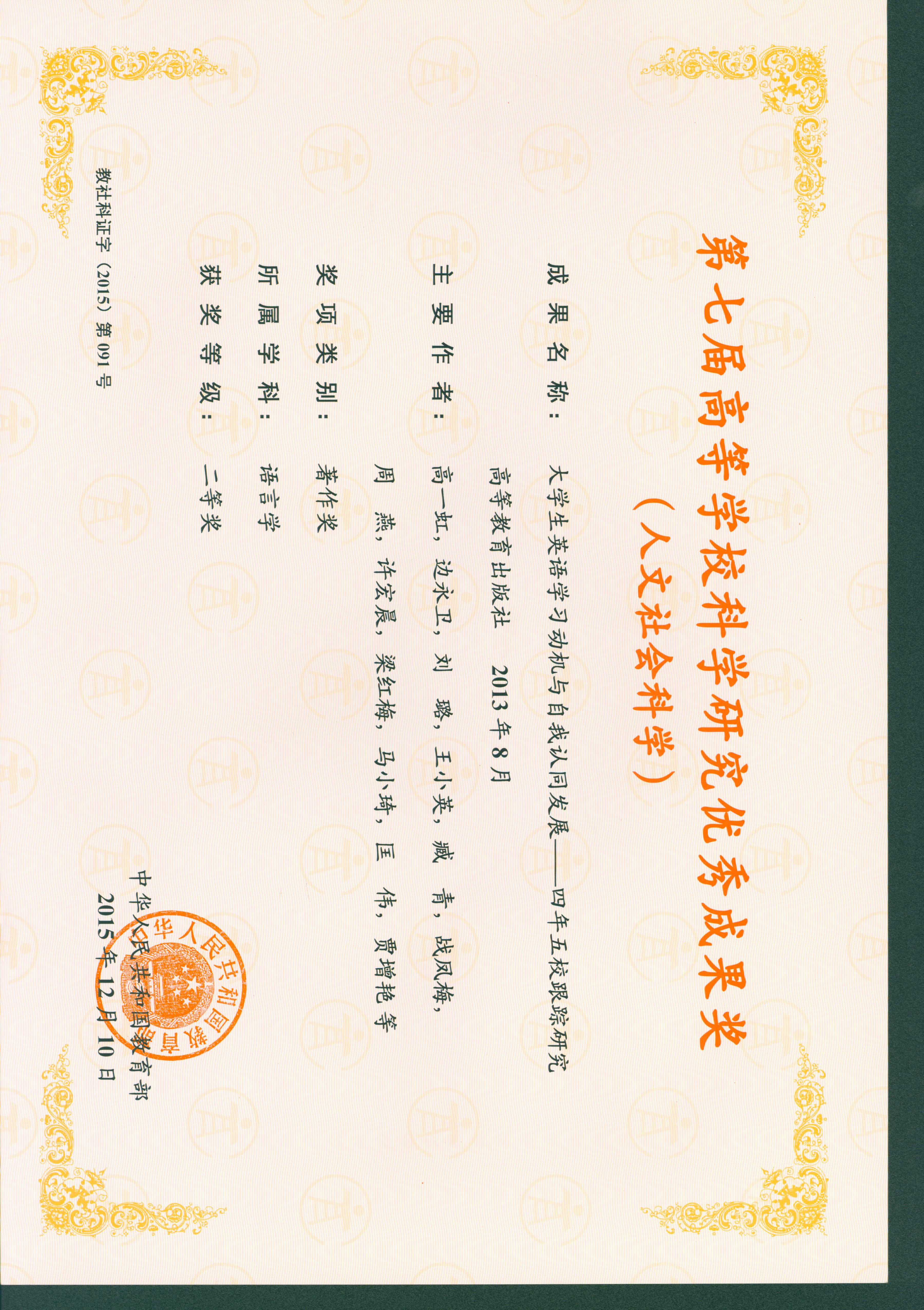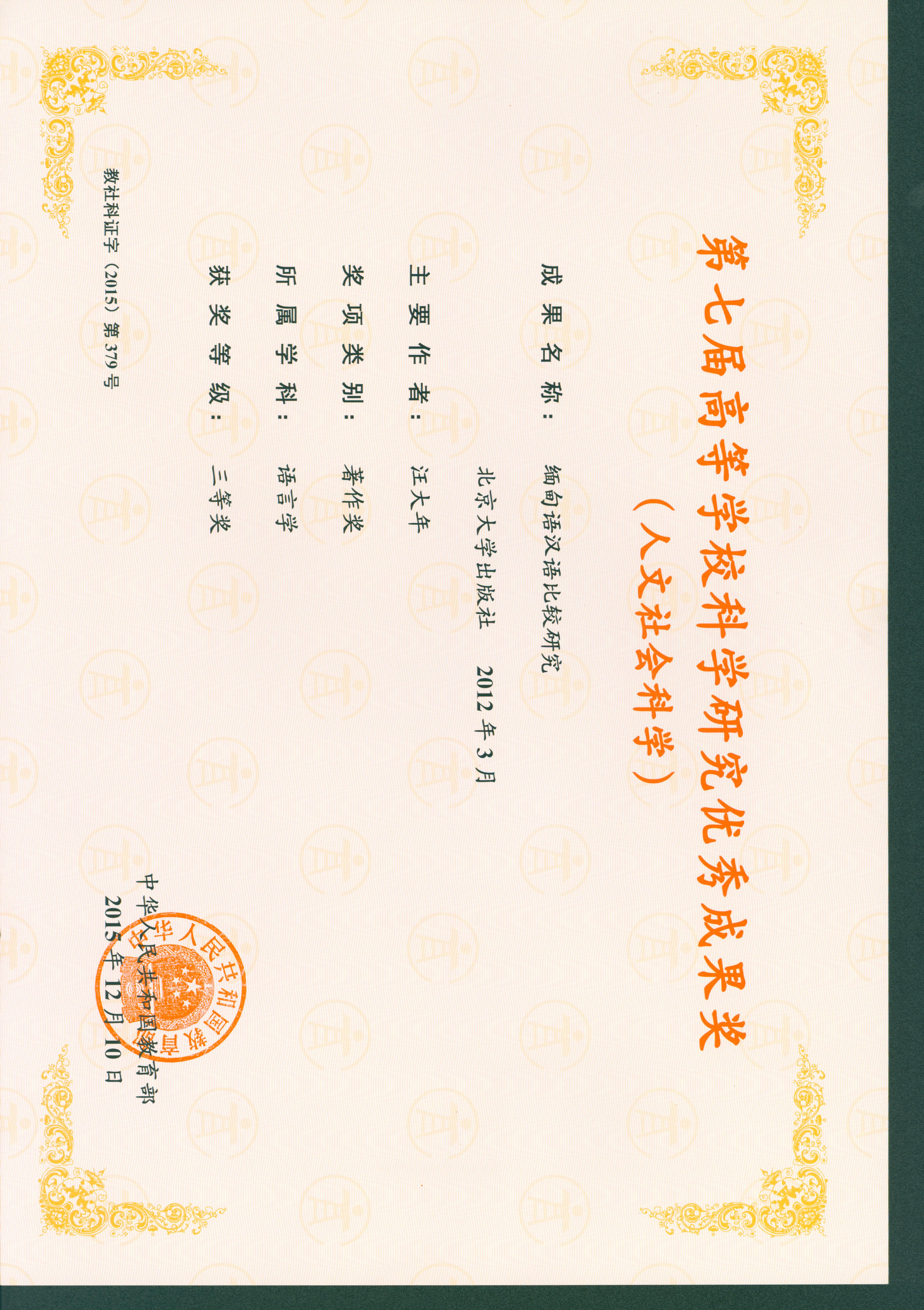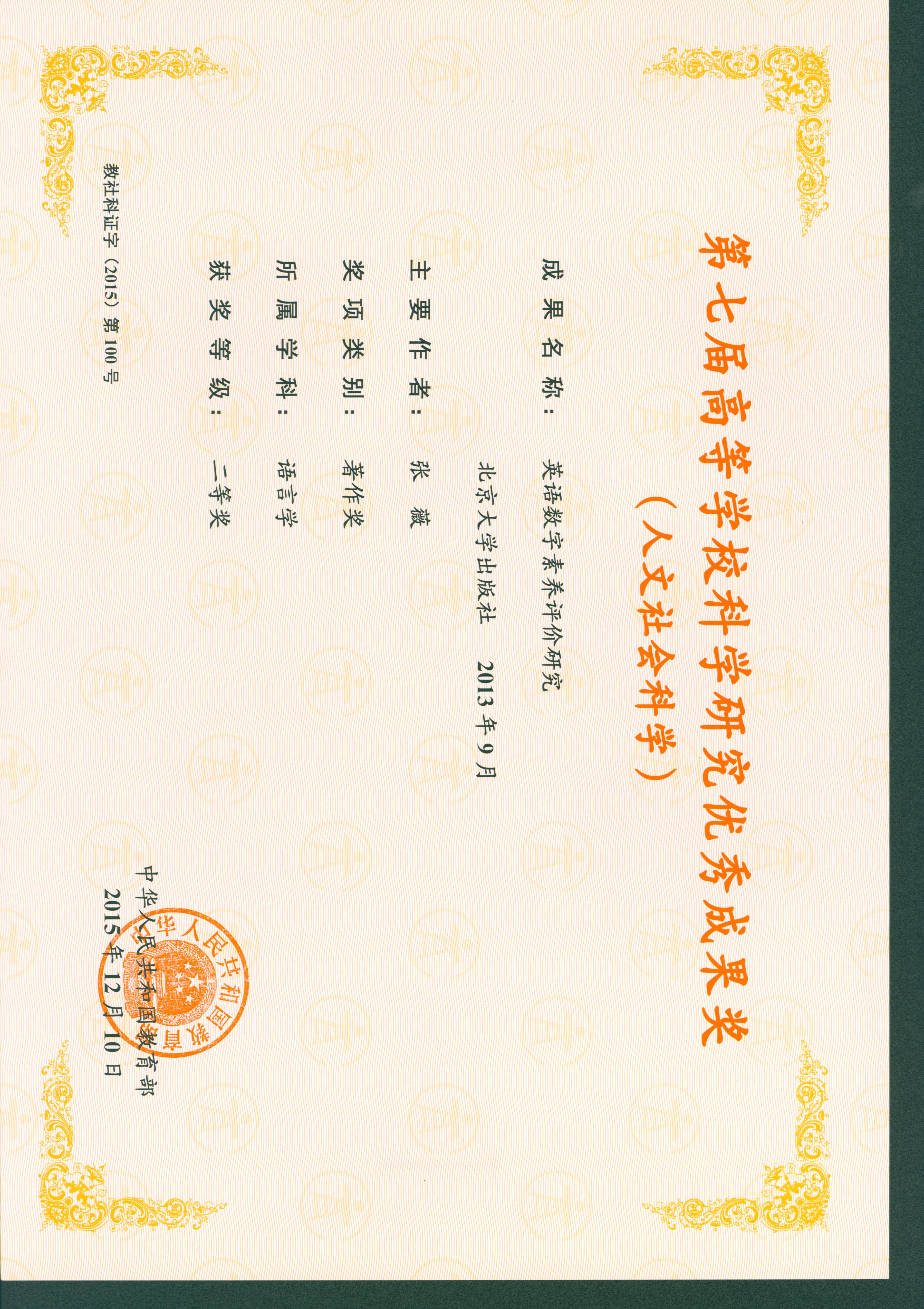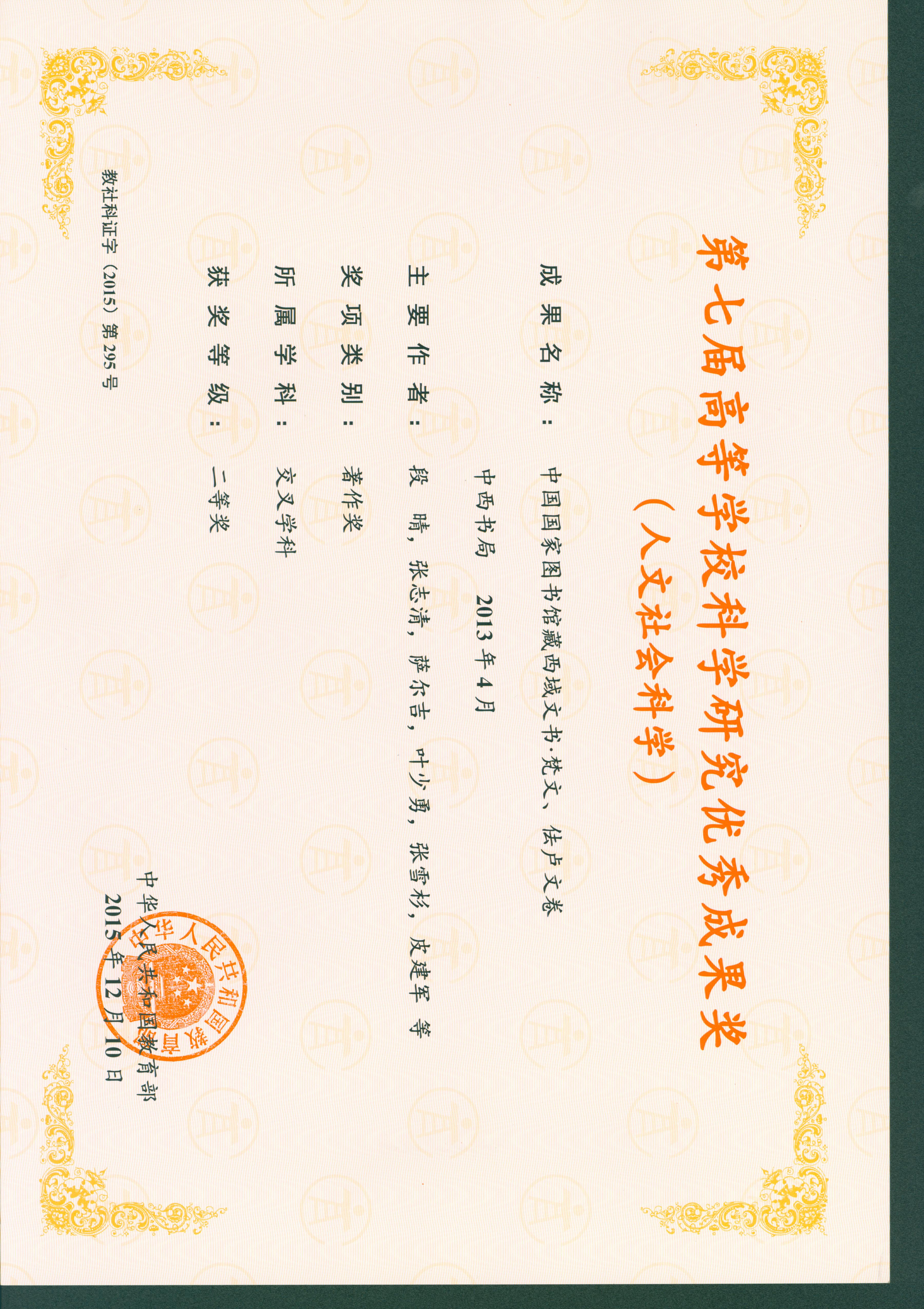 第七届教育部高校科学研究优秀奖:7项。获奖时间:2015年12月10日