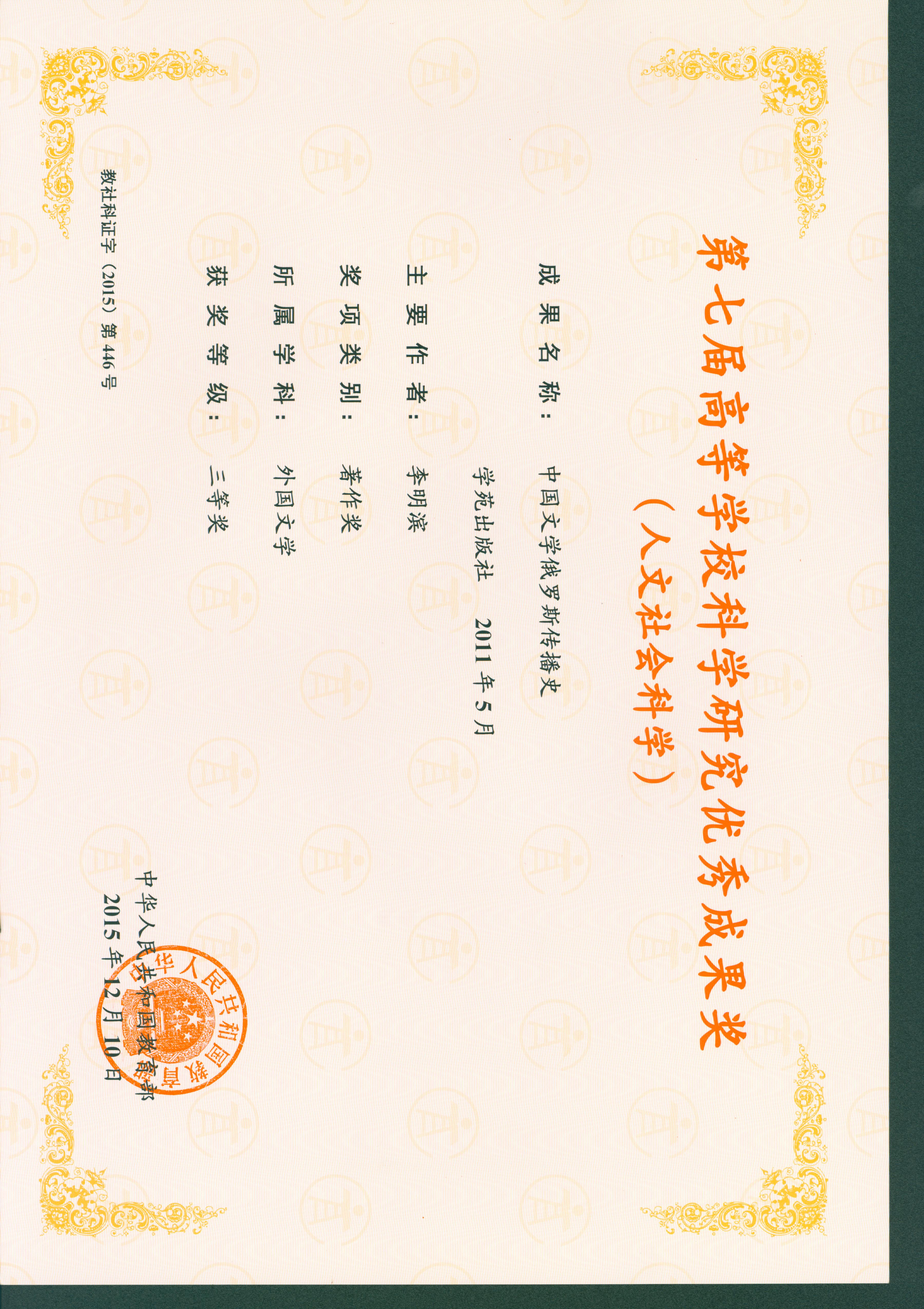 教育部高校科学研究优秀奖证书