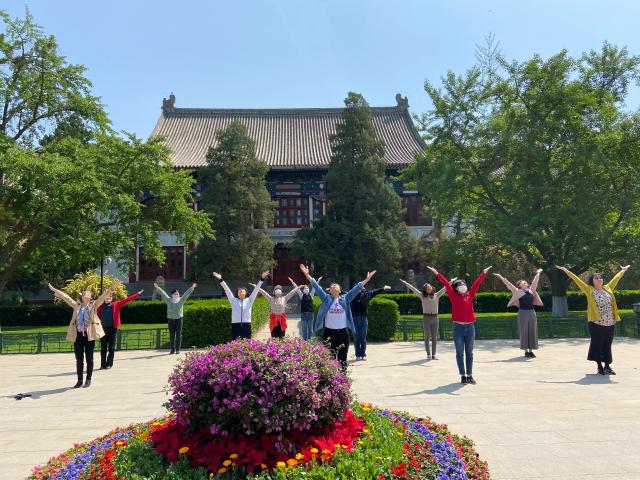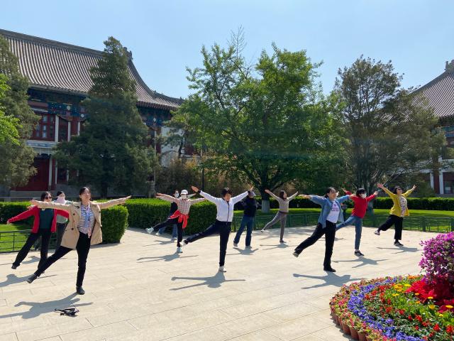 沐浴着和煦的春风和温暖的阳光,伴随着蓝天绿树、碧草红花,老师们在锻炼身体、收获健康的同时,也为忙碌的神经放松压力,劳逸结合。矗立的华表下,外院老师们整齐划一的工间操动作,在一座座古朴静谧的楼宇间,增添了一抹欢乐活力的气息。