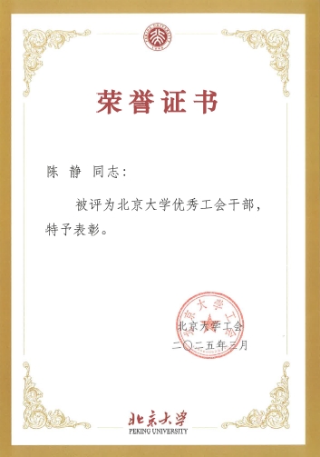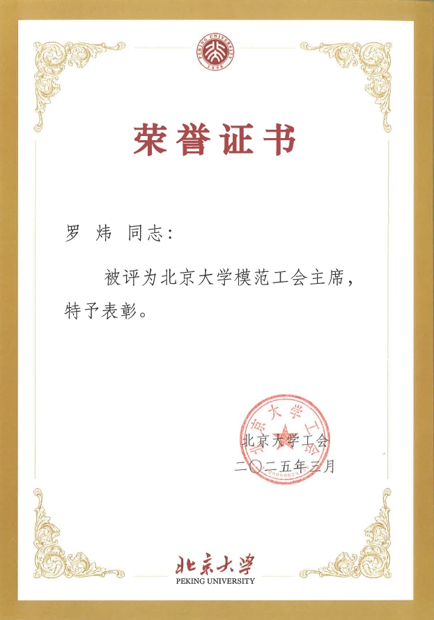 校工会授予罗炜老师2024年度北京大学模范工会主席称号,授予张冬梅、王靖、陈静三位老师2024年度北京大学优秀工会干部称号,授予冯一帆老师2024年度北京大学优秀工会积极分子称号。