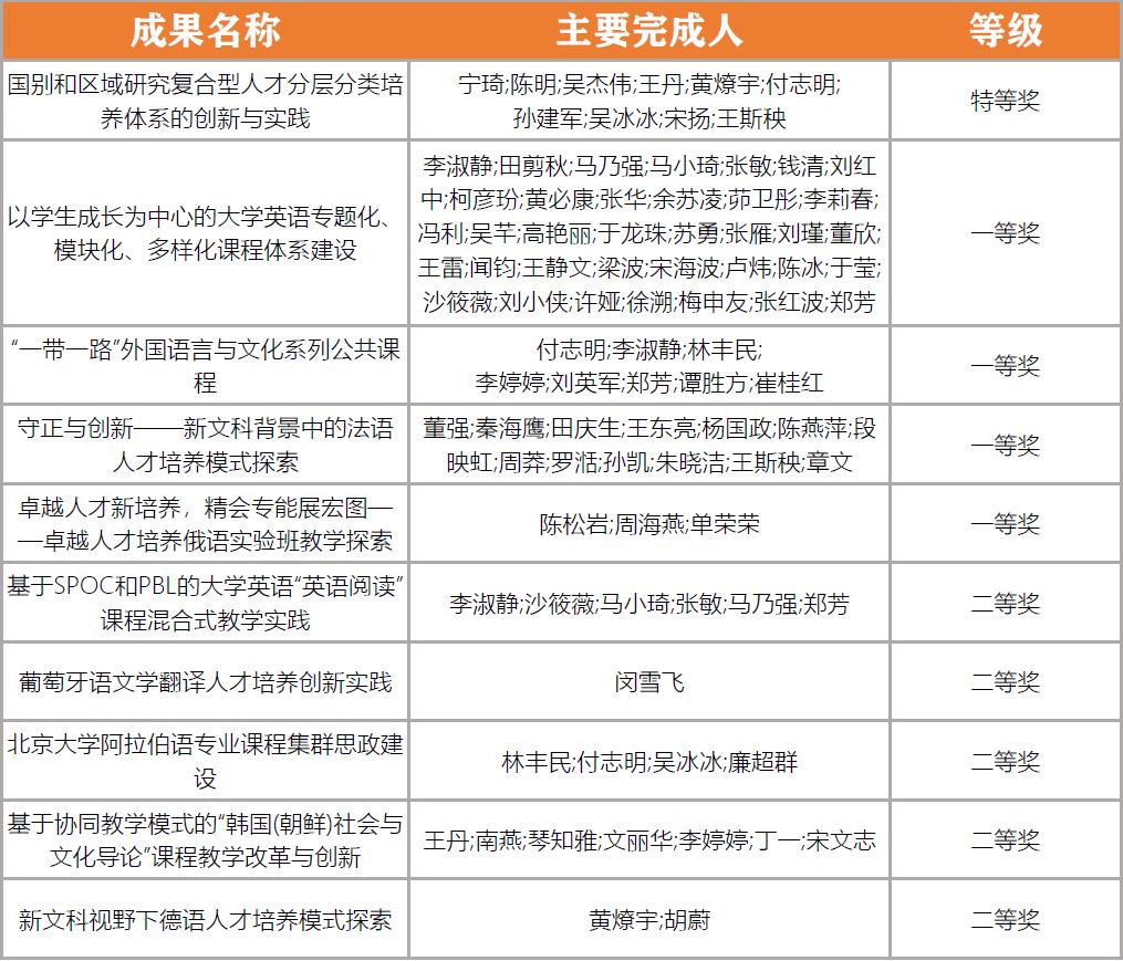 近日我院教师喜获多项教学奖励,10项教学成果荣获北京大学教育教学成果奖(名单附后)。其中2项成果入选北京市教育教学成果奖,分别是宁琦等10位老师完成的“国别和区域研究复合型人才分层分类培养体系的创新与实践”项目荣获一等奖,李淑静等36位老师完成的“以学生成长为中心的大学英语专题化、模块化、多样化课程体系建设”荣获二等奖。
