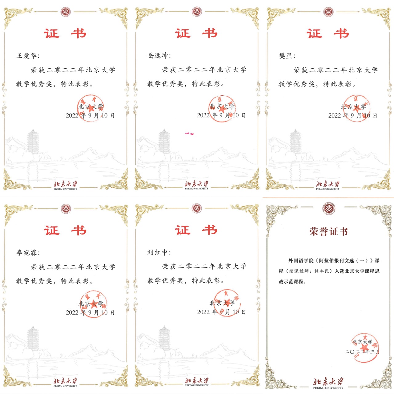 此外,王爱华、刘红中、李宛霖、岳远坤、樊星荣获2022年北京大学教学优秀奖,《阿拉伯报刊文选(一)》(授课教师:林丰民)入选北京大学课程思政示范课程。