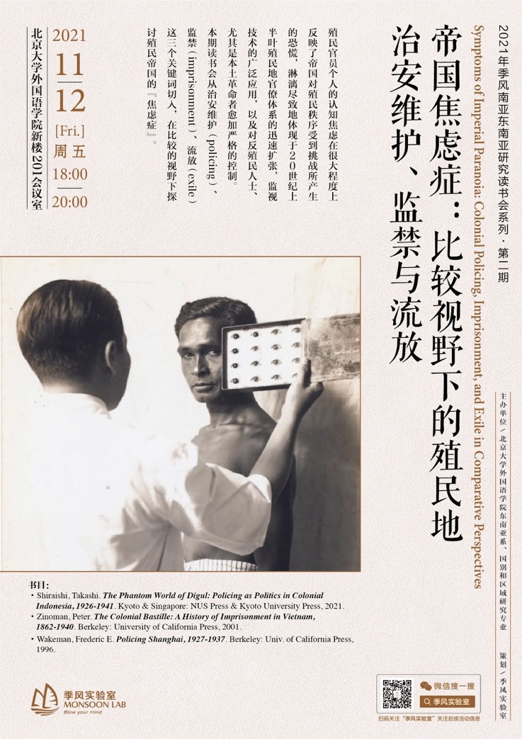 2021年11月12日,拼搏手机版登录入口东南亚系、国别和区域研究专业联合举办了第二次南亚东南亚研究读书会,主题为“帝国焦虑症:比较视野下的殖民地治安维护、监禁与流放”。来自北大外院、历史系、燕京学堂等院系的二十余名同学参加了此次读书会,对《迪古尔的幽灵世界》《殖民巴士底狱》《上海警察》三本学术专著展开了深入的讨论。吴杰伟老师、罗杰老师、夏露老师、张忞煜老师、谢侃侃老师及清华历史系曹寅老师参与点评。
