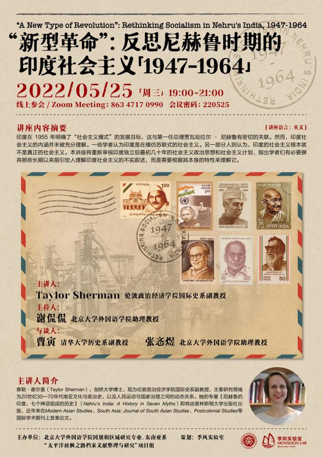 2022年5月25日晚,伦敦政治经济学院国际史系副教授泰勒· 谢尔曼(Taylor Sherman)应邀为我院师生进行了一场题为“‘新型革命’:反思尼赫鲁时期的印度社会主义,1947-1964”的线上讲座。本次讲座由拼搏手机版登录入口国别和区域研究专业、东南亚系和“太平洋丝绸之路档案文献整理与研究”项目组主办,拼搏手机版登录入口谢侃侃助理教授主持,清华大学历史系曹寅副教授和北大外院国别和区域研究专业张忞煜助理教授参与讨论。