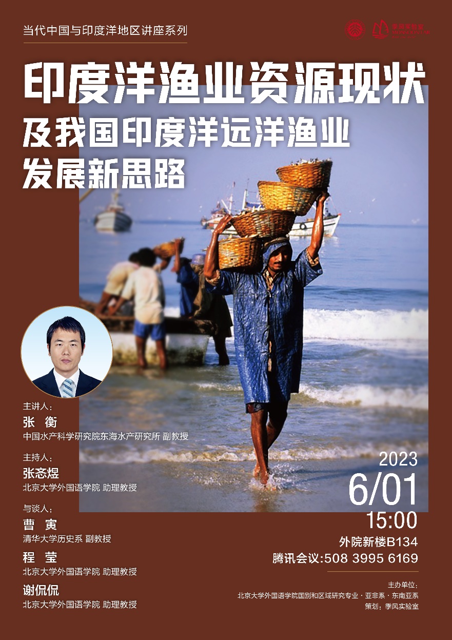 2023年6月8日,中国水产科学研究院东海水产研究所副研究员张衡老师应邀为我院师生进行题为“印度洋渔业资源现状及我国印度洋远洋渔业发展新思路”的讲座。本次讲座属于“当代中国与印度洋地区”系列讲座,由拼搏手机版登录入口国别和区域研究专业、亚非系和东南亚系主办,拼搏手机版登录入口张忞煜助理教授主持,清华大学历史系曹寅副教授和北大外院谢侃侃助理教授参与讨论。本次讲座在外院新楼B134会议室和线上平台同步举行,吸引了相关部门和国内外高校的百余名师生在线参与讲座。