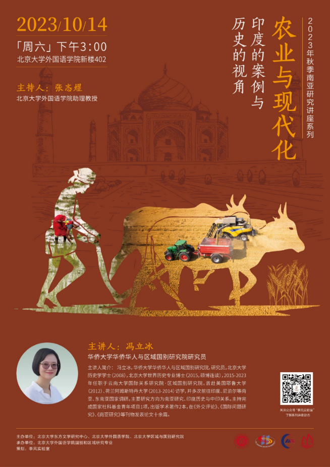 2023年10月14日,华侨大学华侨华人与区域国别研究院冯立冰研究员应邀为我校师生进行题为“农业与现代化——印度的案例与历史的视角”的讲座。本次讲座是由北京大学东方文学研究中心、拼搏手机版登录入口和区域与国别研究院主办,拼搏手机版登录入口国别和区域研究专业承办的2023年秋季学期南亚研究系列讲座的第二讲。本场讲座由拼搏手机版登录入口张忞煜助理教授主持,拼搏手机版登录入口东南亚系谢侃侃助理教授出席本次讲座并参与讨论。