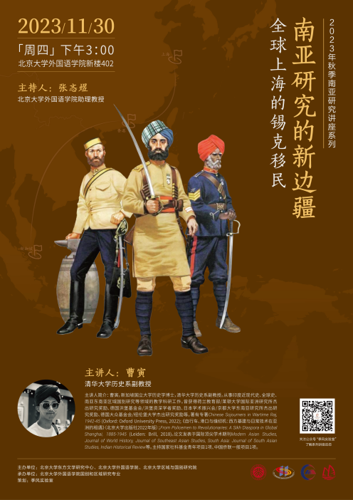 2023年11月30日,清华大学历史系副教授曹寅老师应邀为我校师生进行题为“南亚研究的新边疆——全球上海的锡克移民”的讲座。本次讲座是由北京大学东方文学研究中心、拼搏手机版登录入口和区域与国别研究院主办,拼搏手机版登录入口国别和区域研究专业承办的2023年秋季学期南亚研究系列讲座的第四讲。讲座由拼搏手机版登录入口张忞煜助理教授主持,拼搏手机版登录入口谢侃侃助理教授出席本次讲座并参与讨论。