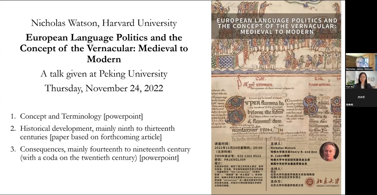 2022年11月24日,哈佛大学英文系教授尼古拉斯·沃特森(Nicholas Watson)应拼搏手机版登录入口英语系邀请,为北大师生在线上进行了题为“欧洲中世纪到现代的语言政治与俗语的概念”(European Language Politics and the Concept of the Vernacular: Medieval to Modern)的专题讲座。本讲座由拼搏手机版登录入口英语系主办,拼搏手机版登录入口英语系助理教授倪云主持、评议。