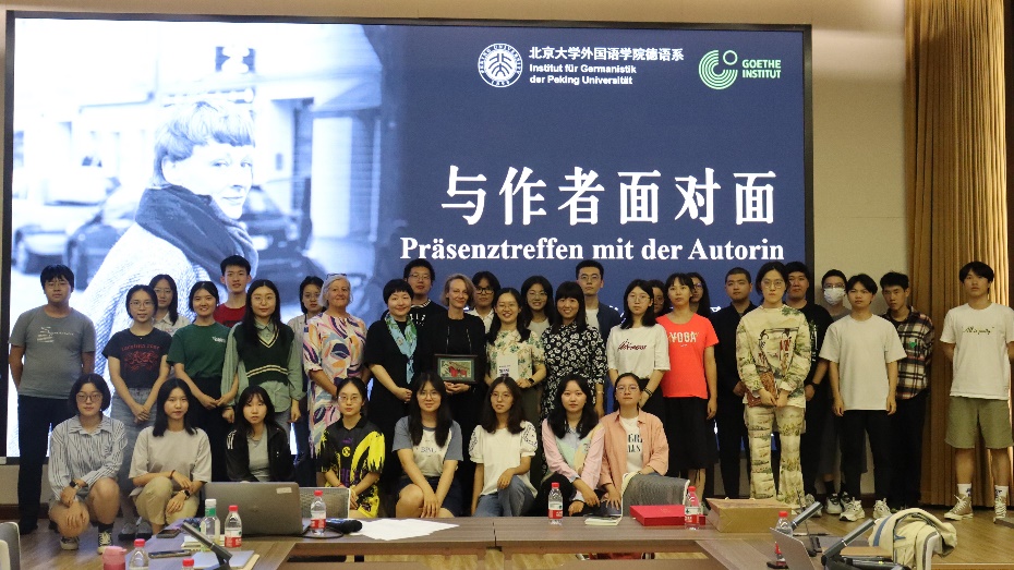 最后,胡蔚老师代表德语系向里德尔女士赠送礼物,与会师生一同合影留念。在这次翻译工作坊中,作者、译者与读者共同度过了一段愉快的时光;同学们收获良多,也希望能够继续参与到系列活动中。