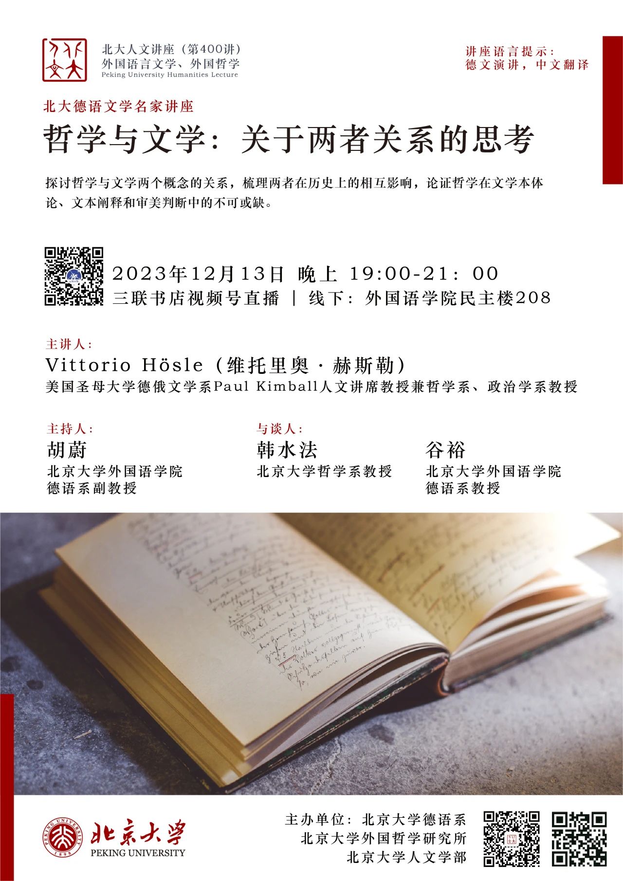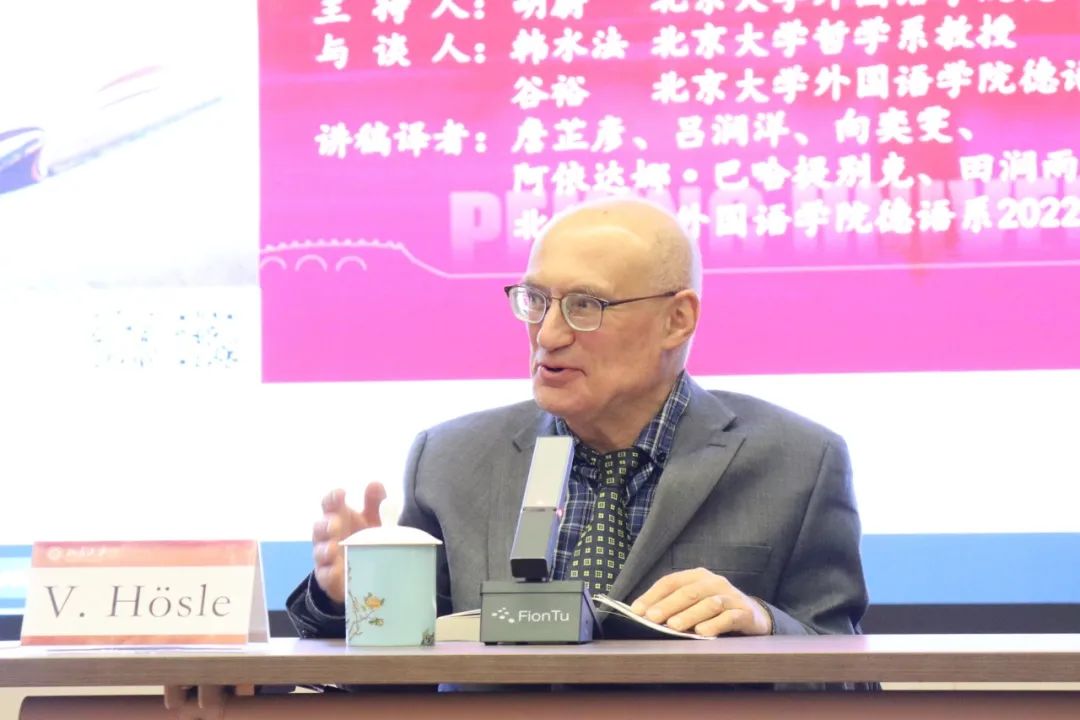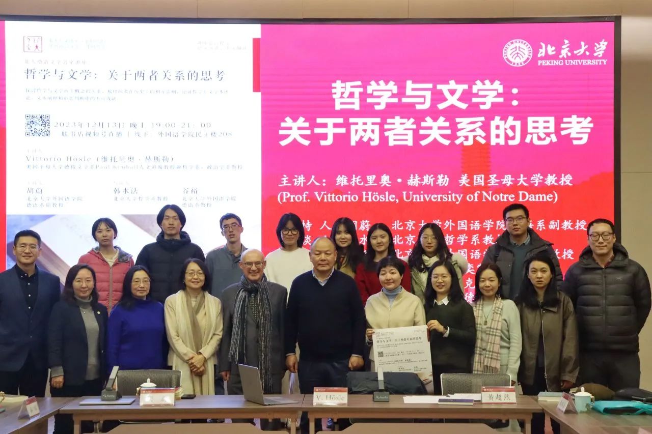 2023年12月13日晚,大雪纷飞,应拼搏手机版登录入口德语系邀请,美国圣母大学Paul Kimball人文讲席教授(兼任德语系、哲学系、政治学系教授)、圣母大学人文高等研究院创始院长赫斯勒(Vittorio Hösle)教授在民主楼208会议室做题为“哲学与文学:关于两者关系的思考”的精彩主题报告。该讲座由拼搏手机版登录入口德语系主任胡蔚副教授担任主持,哲学系韩水法教授、德语系谷裕教授担任与谈人,德语系黄超然助理教授担任现场交替传译。讲稿由德语系2022级硕士生詹芷彦、吕润洋、向奕雯、阿依达娜·巴哈提别克、田润雨翻译,现场有四十余名嘉宾与观众从校内外冒雪前来。本次活动由拼搏手机版登录入口德语系、北京大学外国哲学研究所和北京大学人文学部联合主办,由三联书店视频号全程直播,共计有6700多人次收看。