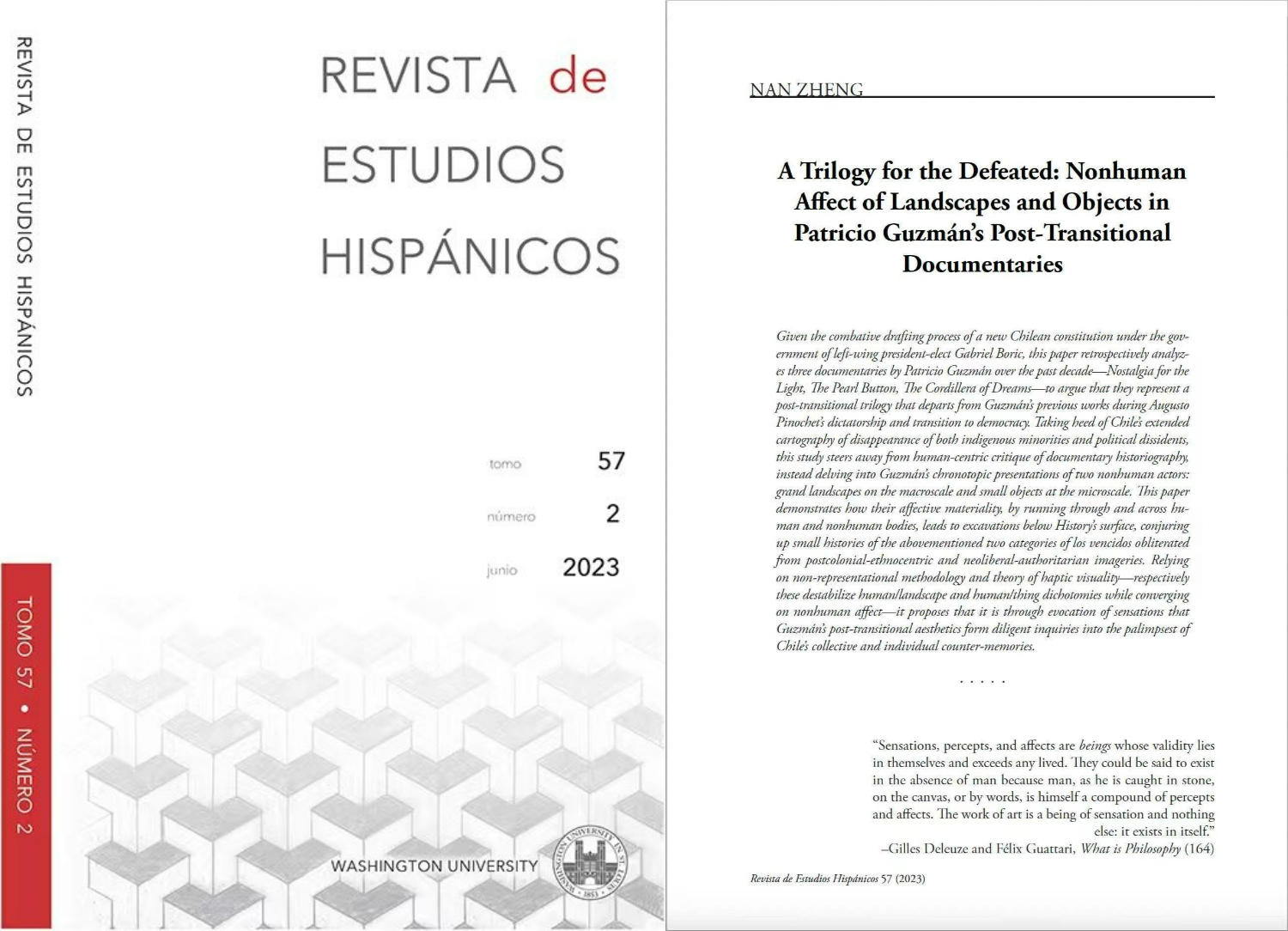 拼搏手机版登录入口西葡意语系助理教授郑楠作为唯一作者的学术研究型论文《献给战败者的三部曲:帕特里西奥·古斯曼民主过渡后纪录片中风景与物件的非人类情动》(“A Trilogy for the Defeated: Nonhuman Affect of Landscapes and Objects in Patricio Guzmán’s Post-Transitional Documentaries”),近期在A&HCI来源期刊《西班牙语世界研究期刊》( Revista de Estudios Hispánicos )2023年第2期刊登。《西班牙语世界研究期刊》由美国圣路易斯华盛顿大学罗曼语语言文学系主办,采用严格的多轮匿名审稿制度,刊登西班牙语国家和地区文学和文化研究、电影研究和文艺理论批评研究等方向的西班牙语或英语学术论文。该期刊现位列JCR期刊引证报告罗曼语文学研究类一区,是国际学术研究界公认的权威期刊。郑楠老师的论文是该期刊自1967年创刊以来中国学者的首次发表,也是国际权威学术期刊第一篇整体研析古斯曼纪录片三部曲并尝试命名的学术研究型论文。