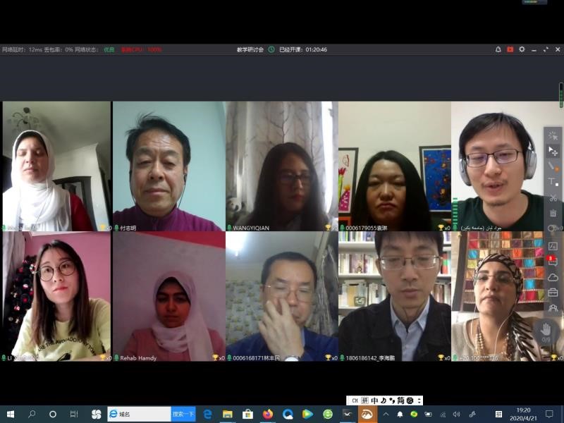 2020年4月21日,拼搏手机版登录入口、埃及开罗大学文学院部分教师召开视频会议,就新冠疫情期间双方网络授课的经验与成果进行了分享。来自拼搏手机版登录入口阿拉伯语系、埃及开罗大学中文系、开罗大学孔子学院的11名教师通过ClassIn平台参与了此次会议。会议由拼搏手机版登录入口副院长付志明教授主持。