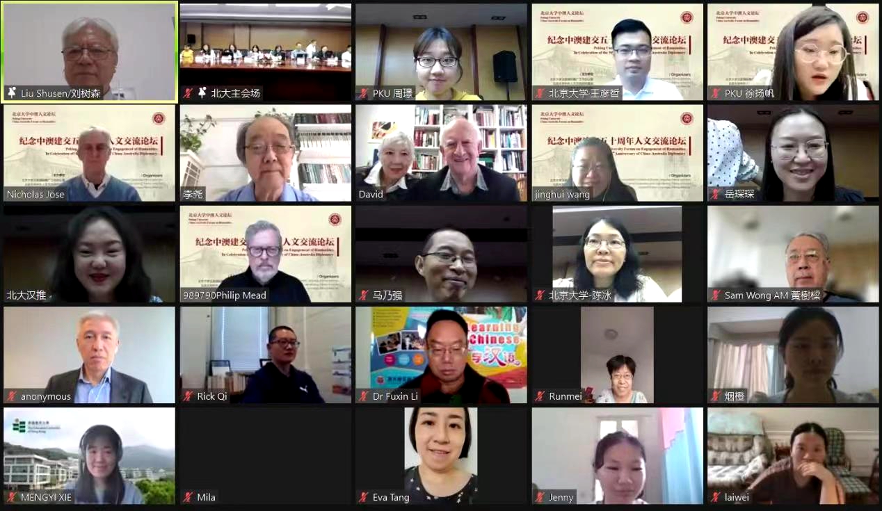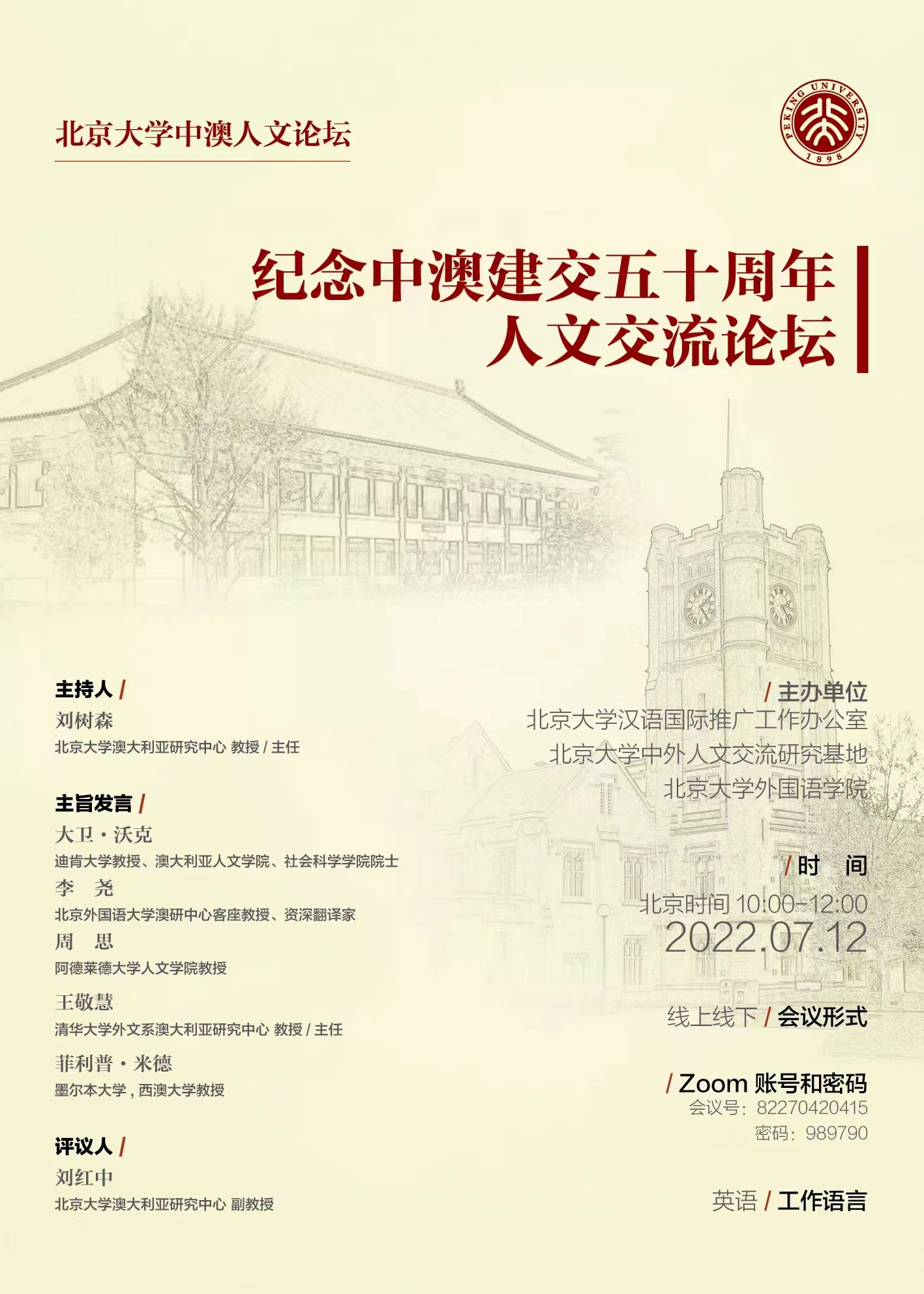 7月12日,由北京大学汉语国际推广工作办公室、北京大学中外人文交流研究基地、拼搏手机版登录入口联合主办的“庆祝中澳建交五十周年人文交流论坛”通过线上线下相结合的方式成功召开。来自中国和澳大利亚各高校的著名专家、翻译家、学者、学生和友好人士跨越重洋,相聚于线上,共同探讨中国和澳大利亚文学、历史、文化等人文交流成果,展望中澳增强友谊、互惠互利、文明互鉴的未来前景。