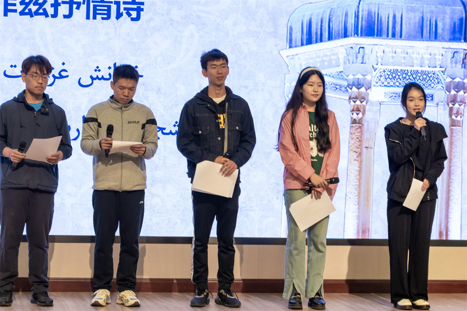 在座谈间隙,波斯语专业的本科生、硕士以及博士研究生朗诵了多首哈菲兹抒情诗,活跃了气氛。同时,中伊双方代表用哈菲兹诗集占卜,共同庆祝哈菲兹纪念日。在活动的最后,陈明院长与巴赫蒂亚尔大使代表宾主双方互赠纪念品,伊朗使馆还向波斯语教研室赠送了一批波斯语书籍。