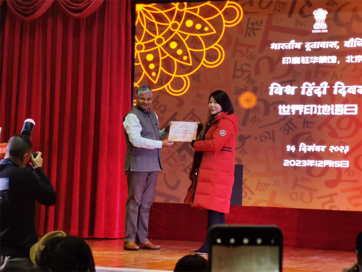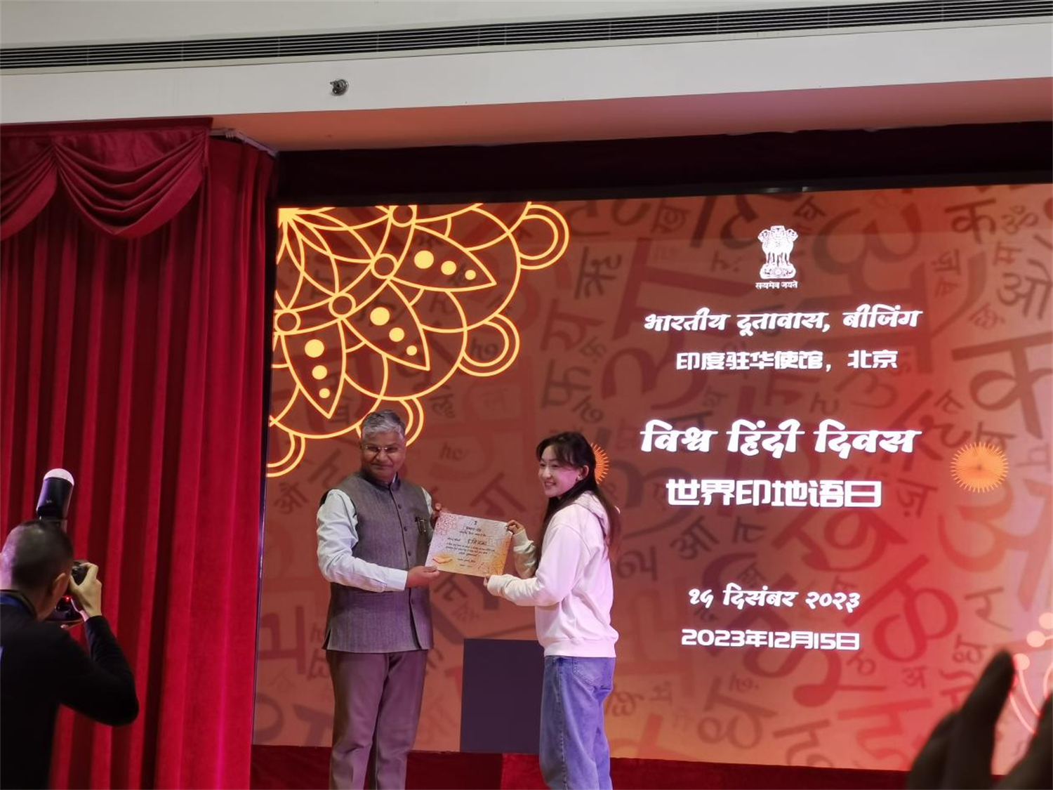庆祝活动在印度驻华大使罗国栋(Pradeep Kumar Rawat)先生及学界前辈的致辞中拉开帷幕。庆祝活动包括“印地语诗歌朗诵比赛”和“印地语节目展演”等环节,来自北京大学、清华大学、北京外国语大学、中国传媒大学、北京第二拼搏手机版登录入口等高校师生和中国国际广播电台国际在线印地语部记者以及在京印度留学生参加该庆祝活动。我院南亚学系印地语专业师生在活动中表现优异,取得佳绩:2021级印地语专业本科生李依诺在“印地语诗歌朗诵比赛”中获最佳表现奖,2021级和2023级印地语本科生的积极展演获得赞誉,我院印地语专业喜获“优秀组织奖”,印地语专业教师代表王靖、贾岩获“优秀指导奖”。