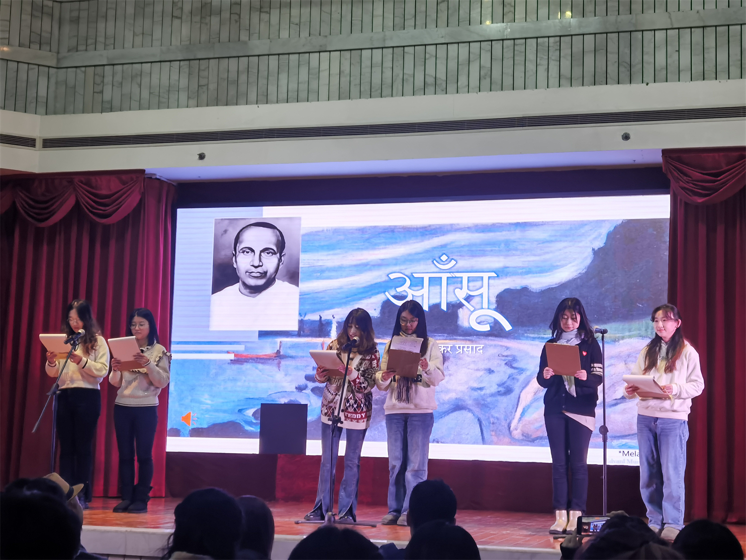 我院2021级印地语专业六位本科生展演的诗朗诵,选自印度阴影主义作家、诗人杰耶辛格尔·伯勒萨德(Jaishankar Prasad)的著名诗作《眼泪》(Annsu)。同学们优美的朗读、流利的发音获得连连掌声与高度评价,展现了印地语学习者对印度经典作品的优秀演绎成果。