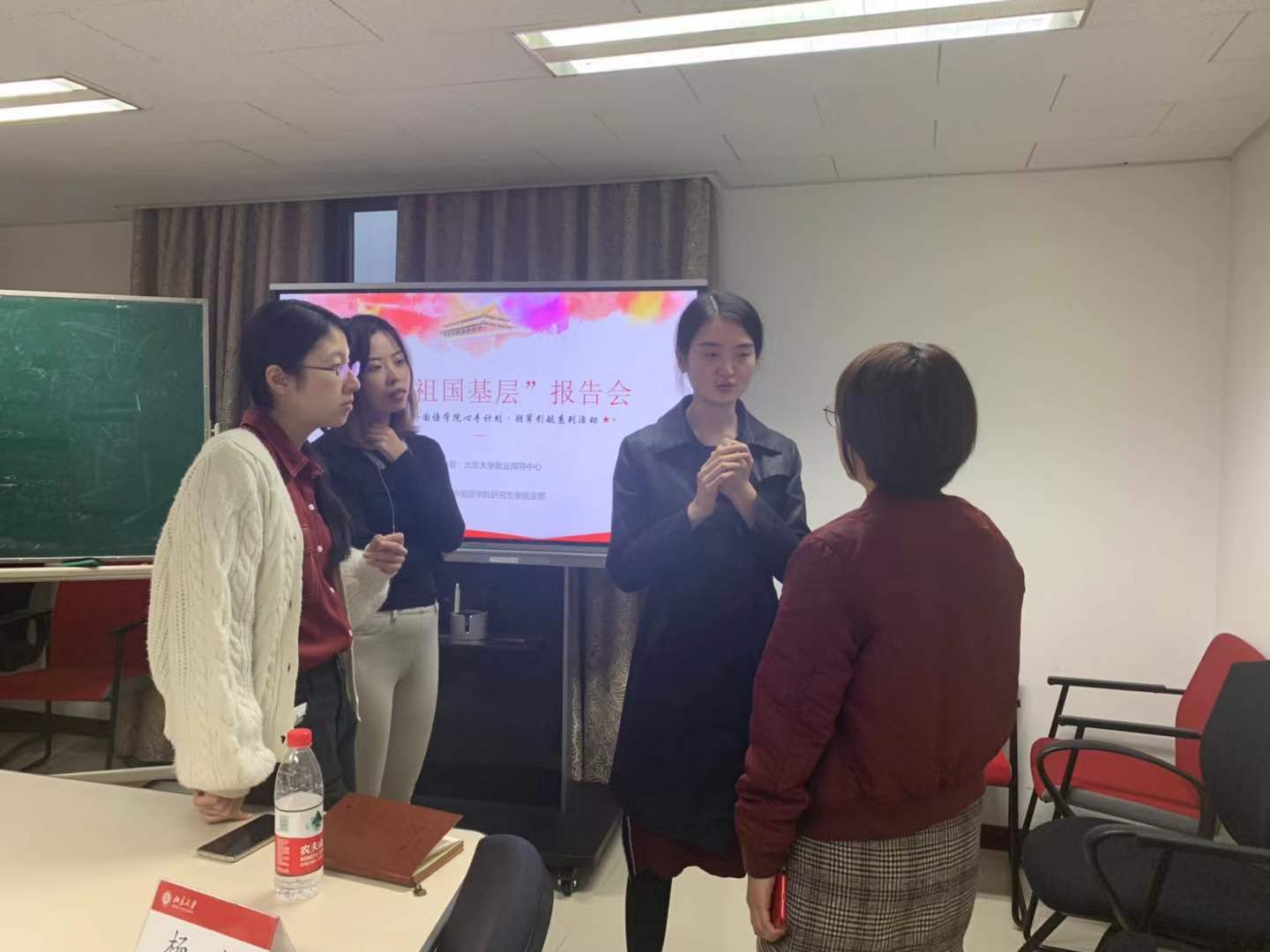 10月12日下午, 拼搏手机版登录入口心手计划•朋辈引航系列活动之“青春告白祖国”——“我在祖国基层”报告会在外院新楼401会议室举行。拼搏手机版登录入口俄语系2017届硕士毕业生,现任重庆市渝中区政府办公室督察二科副科长杨笛,受邀回到母校作基层选调经验报告。此次活动由拼搏手机版登录入口研会就业部王笑然主持,吸引了来自北大多个院系的30余名同学参加活动。拼搏手机版登录入口团委书记卢敏、辅导员丁尧出席了本次活动。
