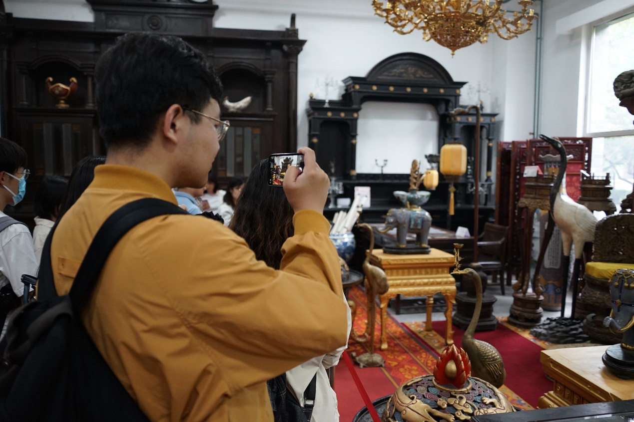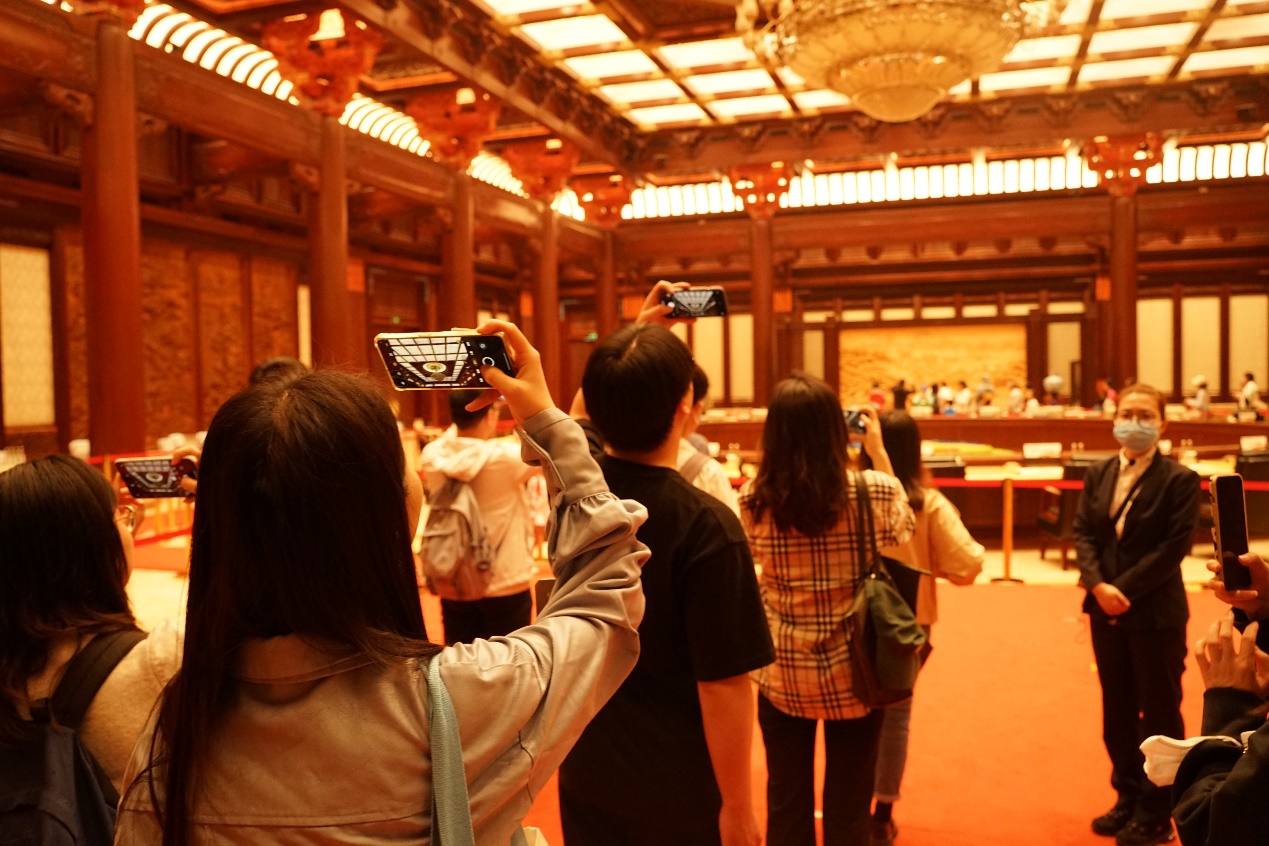 随后,实践团赴“会都”——北京雁栖湖国际会展中心参观。雁栖湖国际会议中心曾承办2014年APEC峰会以及首届与第二届“一带一路”国际合作高峰论坛圆桌峰会。师生一行跟随讲解员参观集贤厅,聆听讲解员讲解集贤厅室内设计的点滴思考与幕后故事,通过室内装潢与陈设,亲身感受峰会盛况。置身集贤厅内,汉唐气象与明清气派并举,古色古香与现代风格交融,融通古今,博雅东西,共同构成我国外交接待空间与国家礼仪空间的新地标,迸发出现代中国的文化自信与壮阔气势。建筑之美彰显人文之美,实践团师生在通过视觉、听觉近距离感受中国传统建筑的文化底蕴与艺术魅力的同时,也愈发坚定行语言专业所长、做文化交流使者的决心。国际盛事与大国外交呼唤扎根本土、放眼世界的复合型语言人才,拼搏手机版登录入口师生大有可为也必将大有作为。