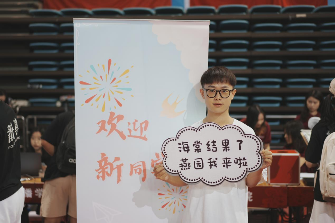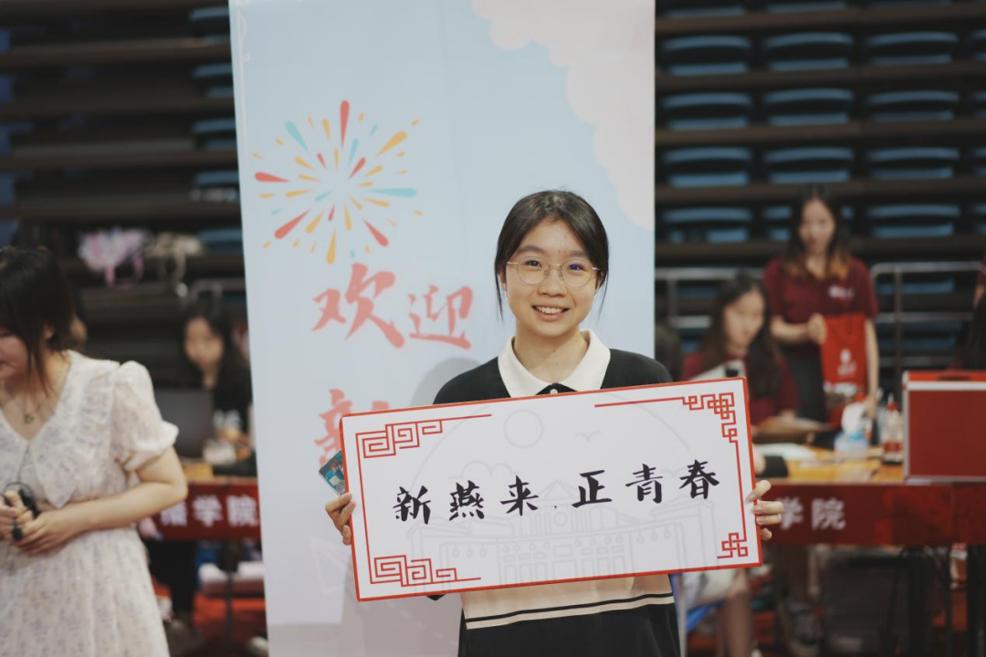 新生们举起姓名牌和外院标语留影时,每一位同学的脸上都绽放着发自内心的笑容。