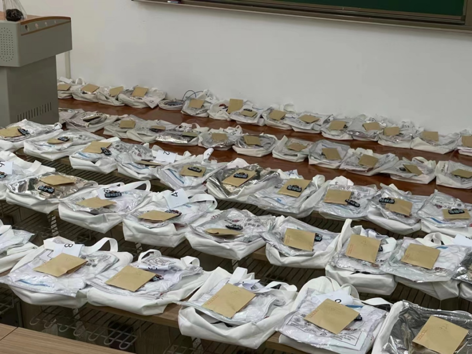 在为新生准备的物料包中,包含有特别定制的姓名牌、内容详实的预防电信诈骗和生活指南、即将陪伴新生度过校园生活的宿舍钥匙、校园卡等物品。它们被妥善安置在北大特色手提袋中,凝聚着外院师生对新生的关怀与祝福。