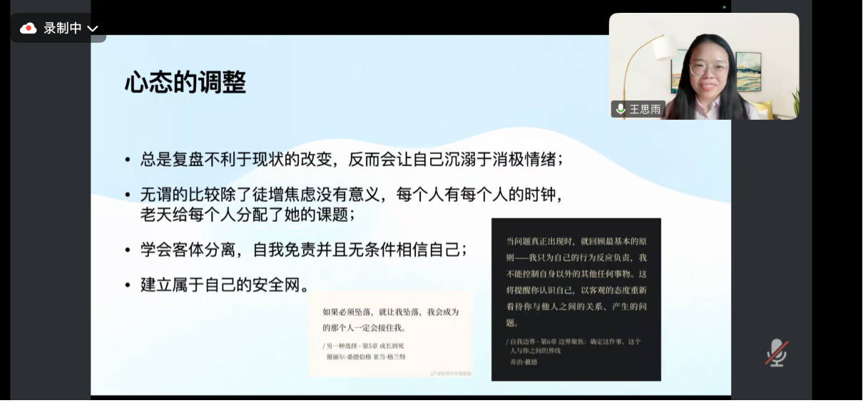 下一位进行分享的是王思雨。她以自己2023-2024年求职季投递高校的真实经历为例,详细剖析了高校求职中的关键环节:从初期海投时遭遇的简历石沉大海,到参加5所院校的层层面试,最终收获满意教职的全过程。针对高校求职策略,王思雨特别分享了四点深刻体会,包括信息时效性、期刊目录差异、心态调整等方面。嘉宾分享环节结束后,同学们在主持人的引导下积极与嘉宾互动交流。嘉宾对同学们提出的有关考核任务、面试内容、教学压力、继续深造还是准备求职等问题进行了回答,他们在建议中指出,高校新入职教师有着极为严格的学术和教学要求,需要同学们在仔细研究政策的同时做好时间规划,实现“研究-教学”与“工作-生活”的双重平衡。在热烈的交流过程中,同学们关于高校求职的种种疑问得到解答,对未来的规划也愈加清晰明确。