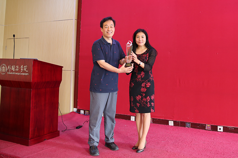 (学院院长、2017年“李大钊奖”获得者宁琦向被评为2018年北京大学优秀共产党员标兵的付志明教授转交荣誉奖牌)