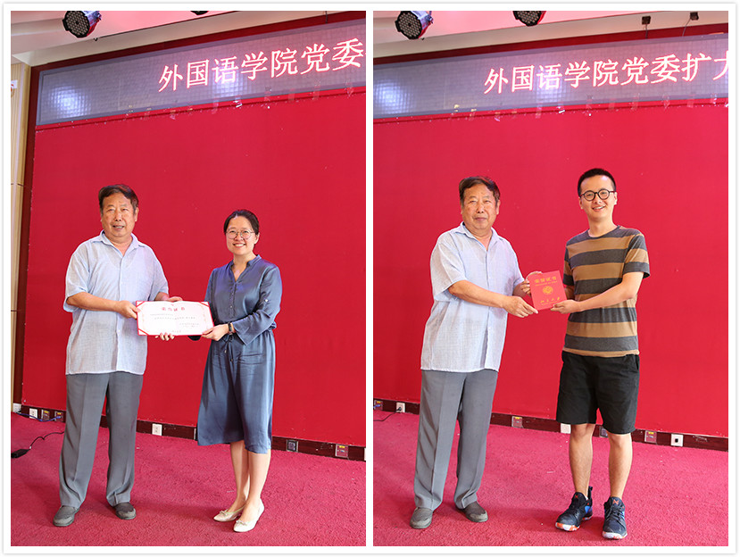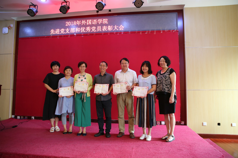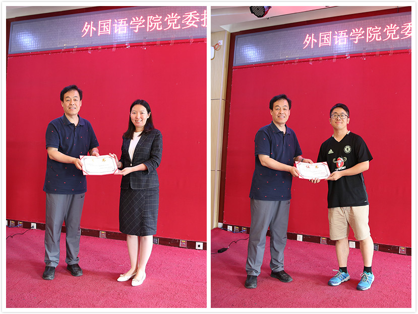 (学院党委委员、副院长付志明向评为2018年外国语先进党支部的东南亚系党支部、2016级硕士生第一党支部颁发获奖证书)