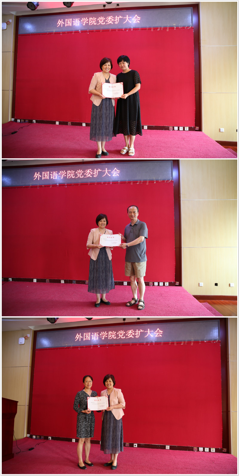 (学院党委书记、2011年“李大钊奖”获得者李淑静向评为2018年北京大学优秀共产党员的王丹、刘建华、周海燕三位教师转交获奖证书)