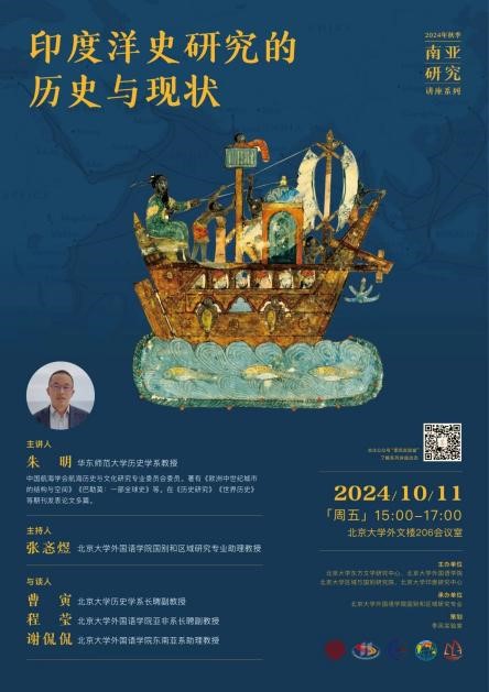 2024年10月11日,华东师范大学历史学系朱明教授应邀为我校师生开展题为“印度洋史研究的历史与现状”的讲座。本次讲座是由北京大学东方文学研究中心、拼搏手机版登录入口、区域与国别研究院和印度研究中心主办,拼搏手机版登录入口国别和区域研究专业承办的2024年秋季学期南亚研究系列讲座的第一讲。讲座由拼搏手机版登录入口助理教授张忞煜主持,华东师范大学历史学系副教授刘伟才、北京大学历史学系长聘副教授曹寅、拼搏手机版登录入口长聘副教授程莹、助理教授谢侃侃参与讨论。