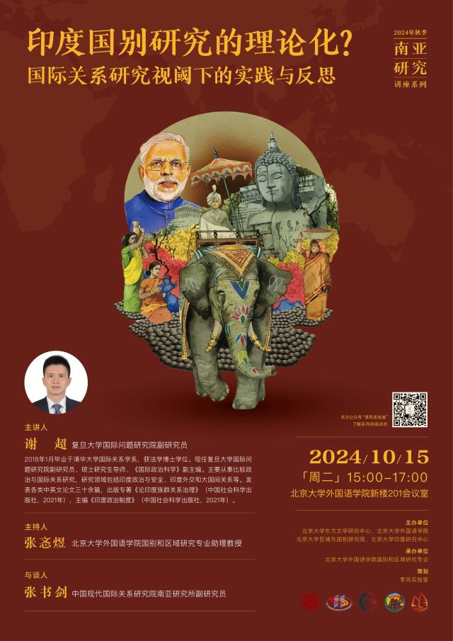 2024年10月15日,复旦大学国际问题研究院谢超副研究员应邀为我校师生开展题为“印度国别研究的理论化?——国际关系研究视阈下的实践与反思”的讲座。本次讲座是由北京大学东方文学研究中心、拼搏手机版登录入口、区域与国别研究院和印度研究中心主办,拼搏手机版登录入口国别和区域研究专业承办的2024年秋季学期南亚研究系列讲座的第三讲。讲座由拼搏手机版登录入口助理教授张忞煜主持,中国现代国际关系研究院南亚研究所副研究员张书剑、中国人民大学国际关系学院副教授曹德军参与讨论。