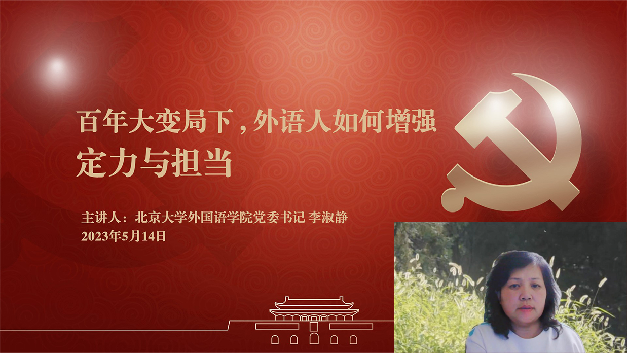 李淑静表示,在学习贯彻习近平新时代中国特色社会主义思想主题教育工作会议上,习近平总书记指出主题教育要牢牢把握“学思想、强党性、重实践、建新功”的总要求。新时代新征程,要实现党的二十大确定的战略目标,作为外语人,要保持战略定力,更要扛起政治责任,要以“学习”为先,更要以“贯彻”为重,做到学思用贯通、知信行统一。她结合习近平新时代中国特色社会主义思想与相关案例,从学思想、强党性、重实践、建新功四个方面对北大外语人提出希望。