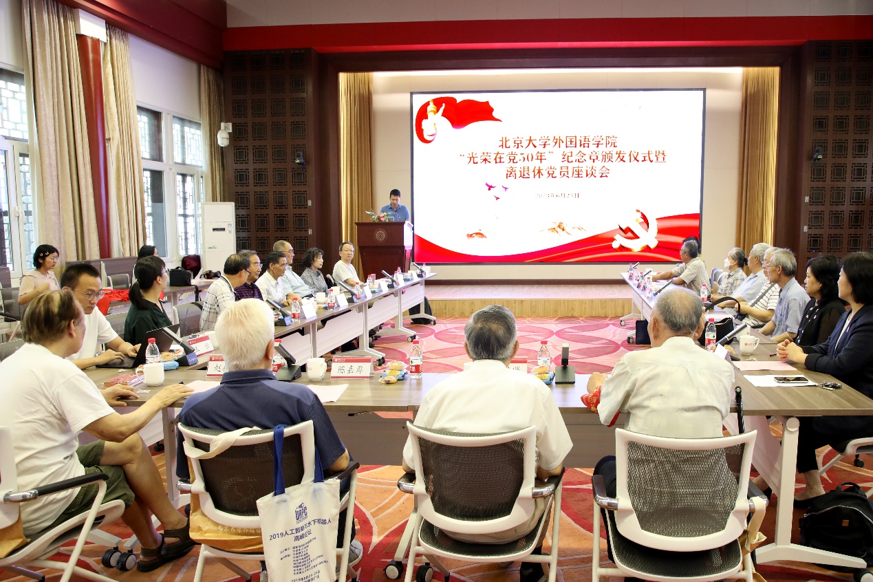 2023年6月23日上午,拼搏手机版登录入口“光荣在党50年”纪念章颁发仪式暨离退休党员座谈会在民主楼208多功能厅举行。北京大学主题教育第三指导组组长关海庭、拼搏手机版登录入口党委书记李淑静和党政领导班子成员以及获颁纪念章党员、老党员代表、劳模代表、离退休党支部书记和支部委员等20余人参加了活动。