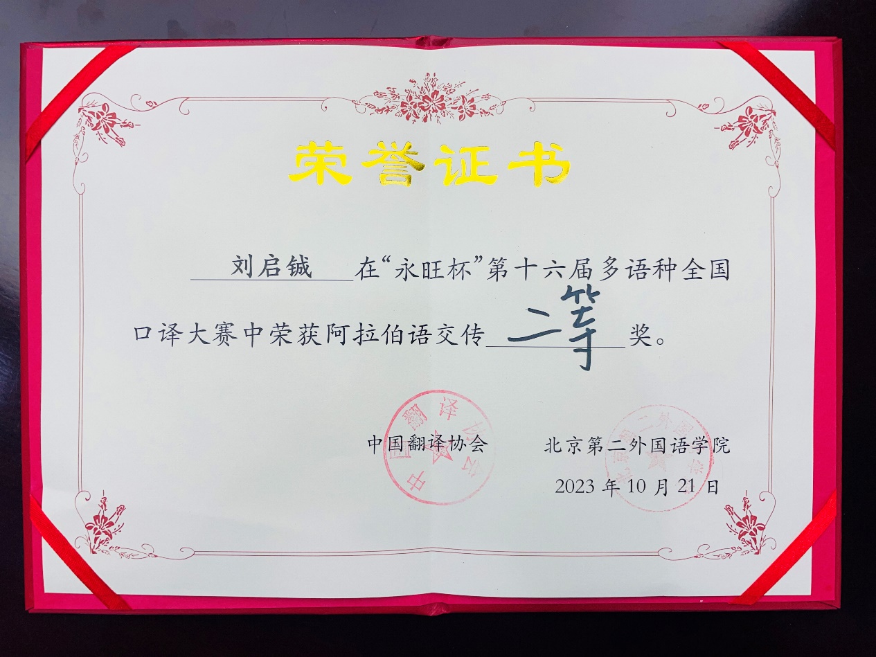 喜报:拼搏手机版登录入口阿拉伯语系刘启铖获“永旺杯”第十六届多语种全国口译大赛二等奖