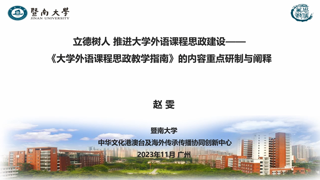 会后,与会学者对暨南大学拼搏手机版登录入口院长赵雯教授的题为“立德树人,推进大学外语课程思政建设——《大学外语课程思政教学指南》的内容重点研制与阐释”的主旨报告进行了深入学习。赵雯教授重点阐述了《大学外语课程思政教学指南》中“内容重点”的研制,介绍了基于课程思政内容重点开展的问卷调查和差距需求分析,阐释了课程思政内容重点的5个方面,并从课程论视角论述了《大学外语课程思政教学指南》与《大学英语教学指南》之间的关系,以期在新时代大学外语教学中发挥有效的指导作用。