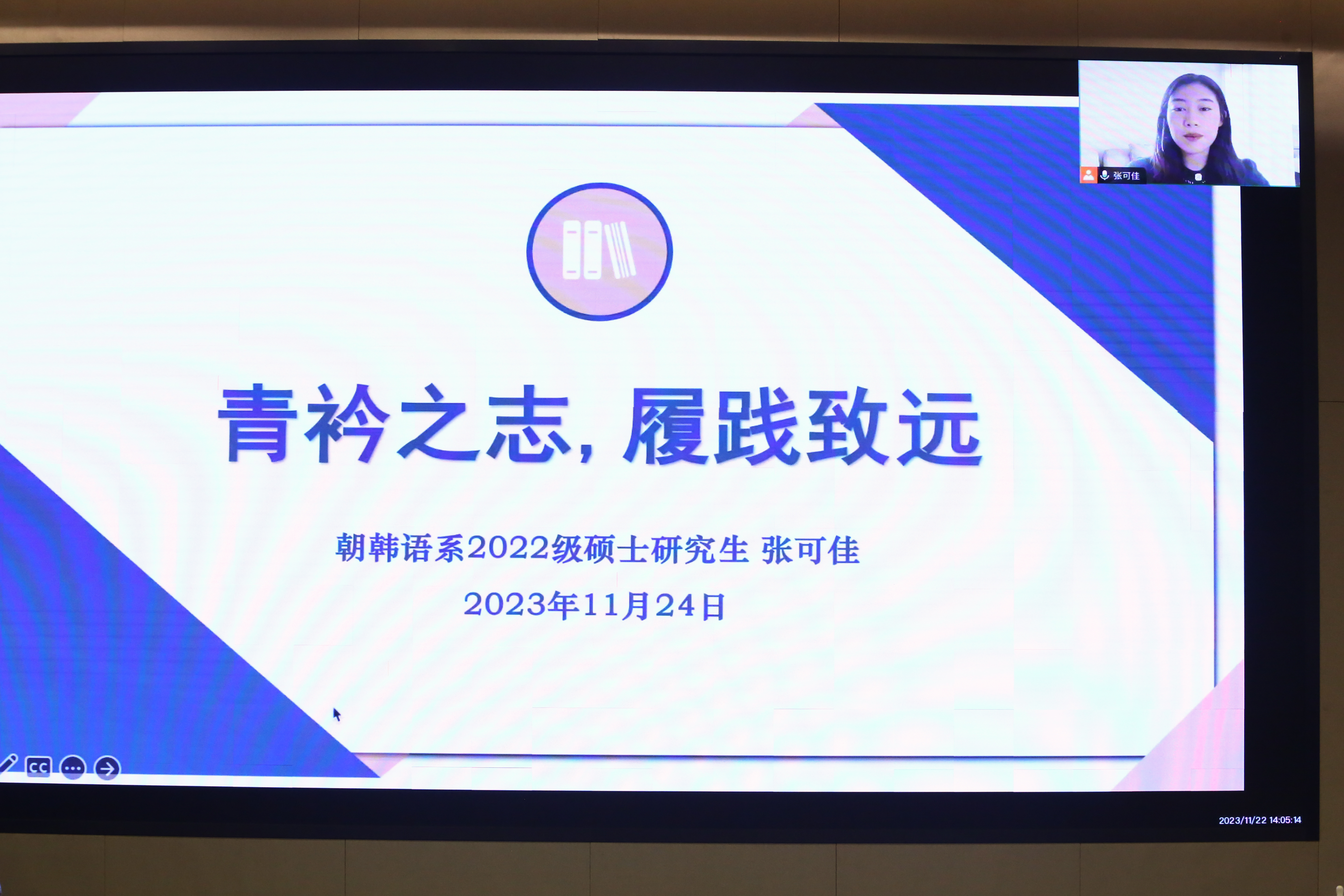 带班辅导员、2022级朝(韩)语硕士研究生张可佳因正在韩国交换,线上分享了一年来的工作感悟和点滴收获。她表示,作为一名在外院学习生活了七年的学生,学院和朝(韩)语系就像一个大家庭。学院的培养让她深刻感受到自己作为外语人的快速成长,作为带班辅导员,她会以用心、关心、爱心继续帮助和陪伴同学们,在成长之路上携手共进。