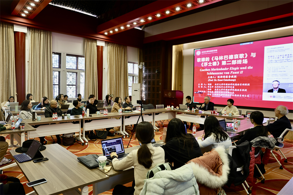 11月16日,第二场讲座“歌德的《马林巴德哀歌》与《浮士德》第二部终场”于拼搏手机版登录入口民主楼208会议室举行。本场讲座由北京大学德语系主任胡蔚副教授主持,社科院外文所李永平研究员、北京大学德语系谷裕教授与谈。欧斯特康普教授从《马林巴德哀歌》与《浮士德》第二部最末“山涧”一场戏的成文史出发,通过细致的文本分析,开创性地揭示了这两部作品之间以“爱”之主题构建的内在观念。欧斯特康教授的分析从作者的生平与文本的创作入手,将文本外部的社会历史背景与文本内部的思想内涵及艺术表达综合起来,扩展了文本的阐释空间,并结合手稿清晰地展示了语文学研究从文本出发、见微知著的基本路径。