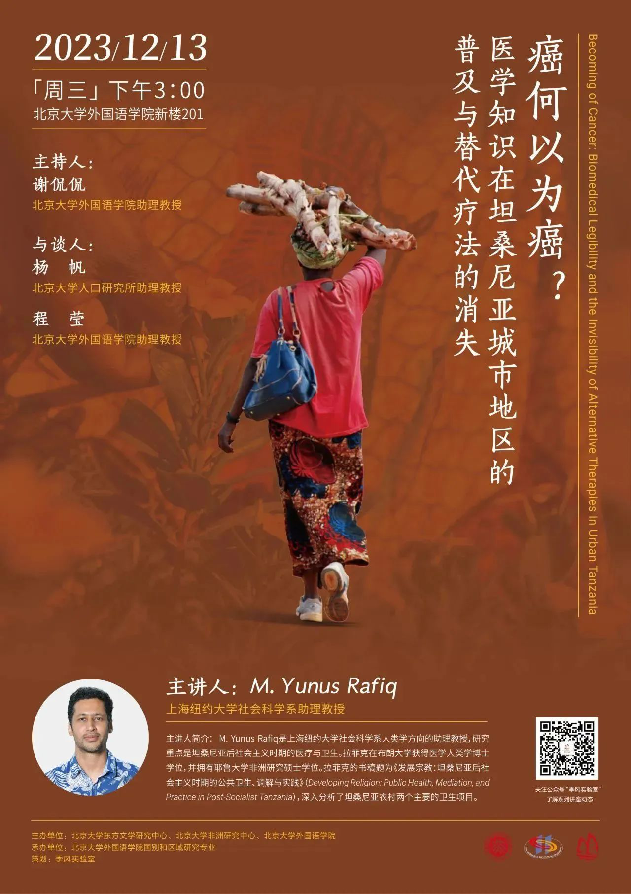 2013年12月13日,上海纽约大学社会科学系人类学方向的助理教授M. Yunus Rafiq老师应邀到北京大学举办题为“癌何以为癌?——医学知识在坦桑尼亚城市地区的普及与替代疗法的消失”的讲座。本次活动由拼搏手机版登录入口、北京大学东方文学研究中心、非洲研究中心主办,拼搏手机版登录入口国别和区域研究专业承办。讲座由外院东南亚系谢侃侃老师主持,亚非系程莹老师以及北大人口研究所杨帆老师出席讲座并参与对谈。