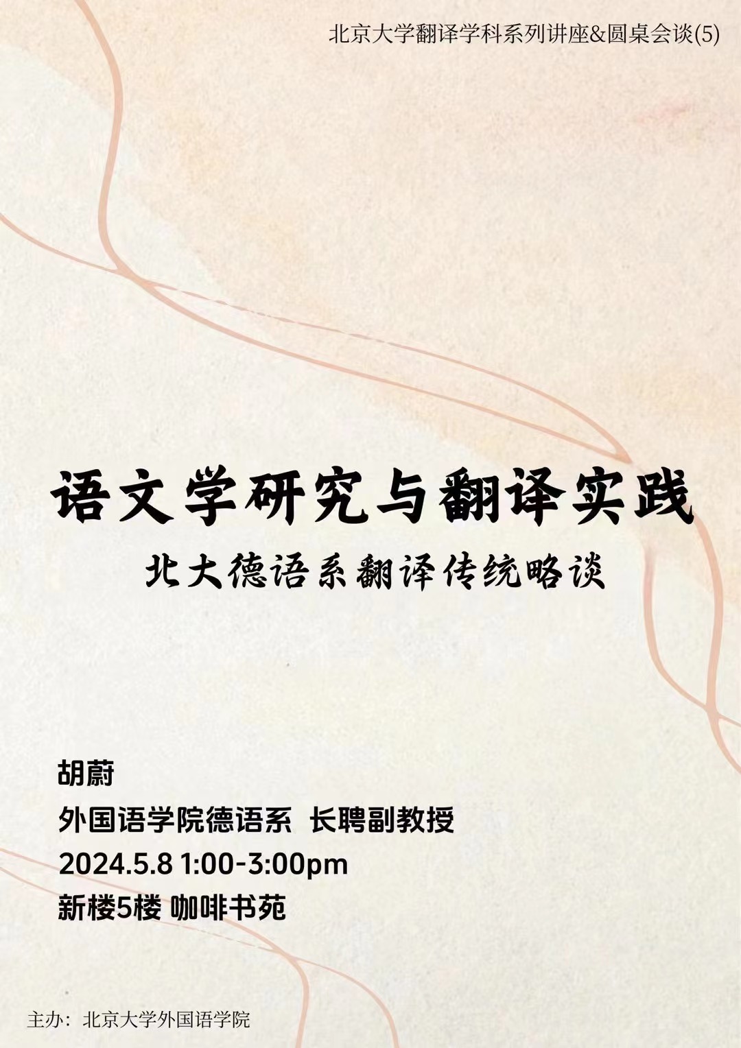 2024年5月9日下午,第五期北京大学翻译学科系列讲座暨圆桌会谈在拼搏手机版登录入口新楼咖啡书苑举行。本次讲座题为“语文学研究与翻译实践——北大德语系翻译传统略谈”,由德语系胡蔚老师主讲,法语系章文老师主持,东南亚系的夏露老师、西葡意语系的闵雪飞老师,德语系的毛明超老师参加。活动也吸引了外院及艺术学院的本硕博同学参与。