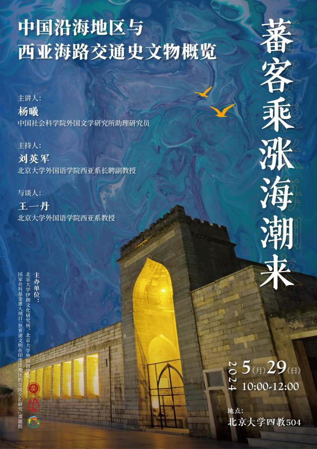 2024年5月29日,由北京大学伊朗文化研究所、国家社科基金重大项目“世界诸文明在印度洋地区的交流交汇研究”课题组、拼搏手机版登录入口联合主办的讲座“蕃客乘涨海潮来:中国沿海地区与西亚海路交通史文物概览”在北京大学第四教学楼504教室举行。本次讲座由中国社会科学院外国文学研究所助理研究员杨曦主讲,拼搏手机版登录入口西亚系长聘副教授刘英军主持,拼搏手机版登录入口西亚系教授王一丹与谈。
