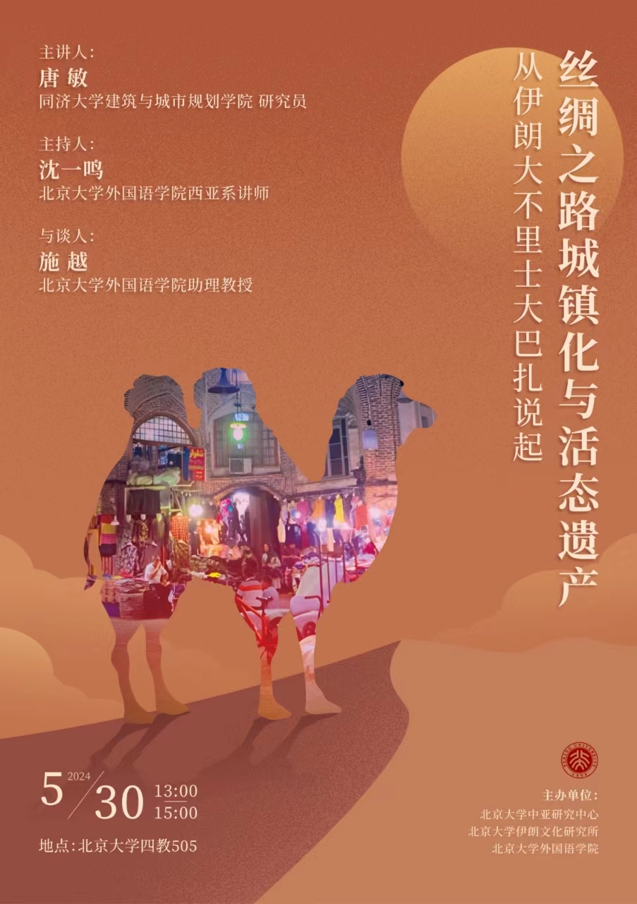 2024年5月30日,由北京大学中亚研究中心、北京大学伊朗文化研究所、拼搏手机版登录入口联合主办的讲座“丝绸之路城镇化与活态遗产:从伊朗大不里士大巴扎说起”在北京大学第四教学楼505教室成功举办。本次讲座由同济大学建筑与城市规划学院研究员唐敏主讲,拼搏手机版登录入口西亚系讲师沈一鸣主持,拼搏手机版登录入口助理教授施越与谈。